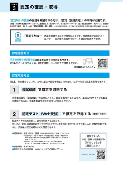 「認定制」の講座の受講を希望される方は、「認定(受講資格)」の取得が必要です。(別冊「2024年度高校グリーンコース入塾案内」高1生38ページ、高2生39・40ページ、高3生広島校は41・42ページ、福岡校・北九州校※は43・44ページの「受験対策講座一覧」参照)※北九州校は2024年4月1日より北九州現役館(㈱河合塾進学研究社主催)になります。講座を受講するための資格のことです。模試成績や認定テストなどで、一定の学力基準をクリアした場合に取得できます。「認定」とは…認定3STEP認定の確認・取得認定確認方法河合塾実施の模試受験生は認定をお持ちの場合があります。Webサイトにログイン後、「認定確認」ページにてご確認ください。認定確認はこちらから▶認定取得方法「認定」をお持ちでない方、さらに上位の認定を希望される方は、以下の方法で認定を取得できます。1模試成績で認定を取得する河合塾実施の「全統模試」の成績によって、認定を取得する方法です。上記Webサイトから認定を確認されるか、受講を希望する校舎窓口へご相談ください。2認定テスト(Web受験)で認定を取得する受験料:無料認定テストの結果を基に、認定を取得する方法です。申し込み・受験・結果確認のすべてをWeb上で行いますので、自宅でいつでも申し込み・受験が可能です。また、受験後は認定結果をすぐに確認できます。●受験教科:英語・数学・国語(認定希望教科を選択して受験してください。)※広島校高2・3生で、理科の「特別選抜講座」を受講ご希望の方は、数学・英語いずれかの「特別選抜講座(中高一貫含む)」の認定を取得してください。※各教科とも認定不要な講座もあります。認定不要な講座は、認定テスト(Web受験)を受験せず、申し込みいただけます。●試験時間:1教科60分●認定テストの出題範囲:Webサイトにてご確認ください。認定テストの申込・受験・結果確認の流れはこちらからご確認ください。2023/11/8(水)公開