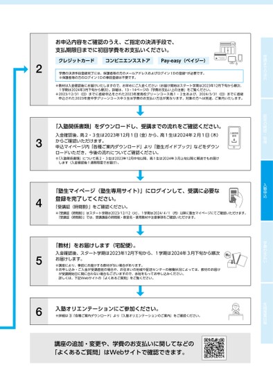受講までの流れ認定の確認・取得入塾申込学費の支払い年間授業日程23456お申込内容をご確認のうえ、ご指定の決済手段で、支払期限日までに初回学費をお支払いください。クレジットカードコンビニエンスストアPay-easy(ペイジー)学費の決済手段登録完了には、保護者等の方のメールアドレスおよびログインⅠDの登録※が必要です。※保護者等の方のログインⅠDの事前登録は不要です。※教材は入金確認後にお届けいたしますので、お早めにご入金ください(お届け開始はスタート学期は2023年12月下旬から順次、1学期は2024年3月下旬から順次)。詳細は、13・14ページの「学費お支払い上の注意」をご覧ください。※2023/12/31(日)までに進級申込をされた2023年度高校グリーンコース高1・2生および、2024/3/31(日)までに進級申込された2023年度中学グリーンコース中3生は学費のお支払い方法が異なります。対象の方へは別途、ご案内いたします。「入塾関係書類」をダウンロードし、受講までの流れをご確認ください。入金確認後、高2・3生は2023年12月1日(金)から、高1生は2024年2月1日(木)からご確認いただけます。申込マイページ内「各種ご案内ダウンロード」より「塾生ガイドブック」などをダウンロードいただき、今後の流れについてご確認ください。※「入塾関係書類」について高2・3生は2023年12月中旬以降、高1生は2024年3月上旬以降に郵送でもお届けします(入金確認後1週間程度でお届け)。入塾関係書類「塾生マイページ(塾生専用サイト)」にログインして、受講に必要な登録を完了してください。「受講証(時間割)」をご確認ください。※「受講証(時間割)」はスタート学期は2023/12/12(火)、1学期は2024/4/1(月)以降に塾生マイページにてご確認いただけます。「受講証(時間割)」では、受講講座の時間割・教室名・使用教材や注意事項をご確認いただけます。「教材」をお届けします(宅配便)。入金確認後、スタート学期は2023年12月下旬から、1学期は2024年3月下旬から順次お届けします。※講座により、事前にお届けする教材がない場合があります。※お申し込み・ご入金が受講直前の場合や、お住まいの地域や配送センターの稼働状況によっては、教材のお届けが受講開始日に間に合わない場合もございますので、余裕をもってお申し込みください。詳しくは、下記Webサイトの「よくあるご質問」をご覧ください。入塾オリエンテーションにご参加ください。※詳細は「各種ご案内ダウンロード」より「入塾オリエンテーションのご案内」をご確認ください。3講座の追加・変更や、学費のお支払いに関してなどの「よくあるご質問」はWebサイトで確認できます。