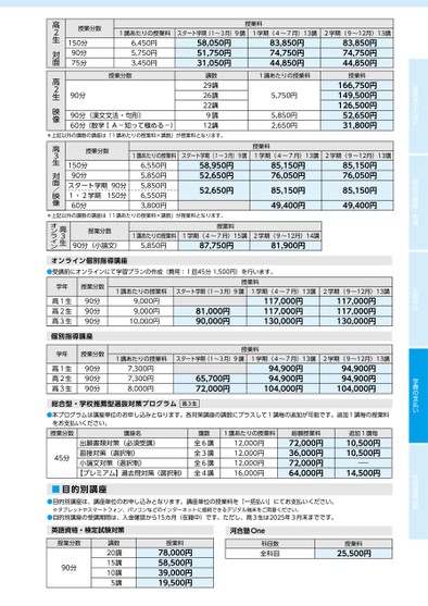 受講までの流れ認定の確認・取得入塾申込学費の支払い年間授業日程授業料1学期(4~7月)13講83,850円74,750円44,850円1講あたりの授業料5,750円5,850円2,650円2学期(9~12月)13講83,850円74,750円44,850円授業料166,750円149,500円126,500円52,650円31,800円授業料1学期(4~7月)13講85,150円76,050円85,150円49,400円2学期(9~12月)13講85,150円76,050円85,150円49,400円スタート学期(1~3月)9講58,050円51,750円31,050円講数29講26講22講9講12講1講あたりの授業料6,450円5,750円3,450円授業分数授業分数150分90分75分90分90分(漢文文法・句形)60分(数学ⅠA-知って極める-)高2生対面高2生映像スタート学期(1~3月)9講58,950円52,650円52,650円1講あたりの授業料6,550円5,850円5,850円6,550円3,800円授業分数150分90分スタート学期90分1・2学期150分60分高3生対面/映像*上記以外の講数の講座は「1講あたりの授業料×講数」が授業料となります。*上記以外の講数の講座は「1講あたりの授業料×講数」が授業料となります。学年授業分数高1生高2生高3生90分90分90分個別指導講座学年授業分数高1生高2生高3生90分90分90分授業料1講あたりの授業料9,000円9,000円10,000円スタート学期(1~3月)9講81,000円90,000円1学期(4~7月)13講117,000円117,000円130,000円2学期(9~12月)13講117,000円117,000円130,000円授業料1講あたりの授業料7,300円7,300円8,000円スタート学期(1~3月)9講65,700円72,000円1学期(4~7月)13講94,900円94,900円104,000円2学期(9~12月)13講94,900円94,900円104,000円総合型・学校推薦型選抜対策プログラム高3生授業料1講あたりの授業料5,850円1学期(4~7月)15講87,750円2学期(9~12月)14講81,900円授業分数90分(小論文)高3生オンラインオンライン個別指導講座●受講前にオンラインにて学習プランの作成(費用:1回45分1,500円)を行います。●本プログラムは講座単位のお申し込みとなります。各対策講座の講数にプラスして1講毎の追加が可能です。追加1講毎の授業料をお支払いください。授業分数講座名出願書類対策(必須受講)面接対策(選択制)小論文対策(選択制)45分【プレミアム】過去問対策(選択制)講数全6講全3講全6講全4講1講あたりの授業料12,000円12,000円12,000円16,000円総額授業料72,000円36,000円72,000円64,000円追加1講毎10,500円10,500円-14,500円■目的別講座●目的別講座は、講座単位のお申し込みとなります。講座単位の授業料を「一括払い」にてお支払いください。※タブレットやスマートフォン、パソコンなどのインターネットに接続できるデジタル端末をご用意ください。●目的別講座の受講期間は、入金確認から15カ月(在籍中)です。ただし、高3生は2025年3月末までです。英語資格・検定試験対策授業分数90分講数20講15講10講5講授業料78,000円58,500円39,000円19,500円河合塾One科目数全科目授業料25,500円