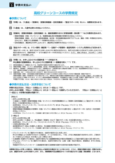 5STEP学費の支払い●学費について高校グリーンコースの学費規定12345「学費」は、「入塾金」・「授業料」(受験対策講座・目的別講座)・「塾生サポート料」をいい、消費税を含みます。「入塾金」は、入塾申込時にお支払いください。「授業料」(受験対策講座・目的別講座)は、講座受講費のほかに学習指導費・教材費(※1)などの費用を含みます。受験対策講座(対面/オンライン)は、受講開始講以降の授業講数の授業料をお支払いください。受験対策講座(映像)、オンライン個別指導講座、総合型・学校推薦型選抜対策プログラムは、講座・学期・年間単位のお申し込みとなり、受講された授業講数(※2)の授業料をお支払いください。目的別講座は、講座単位のお申し込みとなり、講座単位の授業料をお支払いください。「塾生サポート料」は、テスト費用(模試等※3)・在籍データ管理料・施設利用料・システム利用料などを含みます。「塾生サポート料」は、毎月15日までにお申し込みされた場合は当月分から、毎月16日以降から月末までにお申し込みされた場合は翌月分から、受講年度末(※4)までの塾生サポート料をお支払いください。ただし、高校3年生は、2025年2・3月の塾生サポート料を免除します。「学費」は、お申し込みされた受講年度(※4)の料金です。申込講座の受講期間は、申し込みされた受講年度(一部講座を除く(※5))です。※1個別指導講座など一部講座においては、別途有料の副教材を使用する場合があります。※2受験対策講座(映像)、オンライン個別指導講座、総合型・学校推薦型選抜対策プログラムは、講単位で授業料の支払いが発生します。※3模試等は、対象模試・上限回数を定めています。対象模試以外・上限回数を超える模試等の受験については、別途受験費用をお支払いください。また、模試等の未受験による塾生サポート料の返金は一切いたしません。※4受講年度は、高1・2年生は2024年12月末まで、高校3年生は2025年3月末までです。※5受験対策講座(映像)・目的別講座は受講可能開始日から最大15カ月間または高校3年生の3月末まで講座受講・閲覧が可能です。受験対策講座(映像)の受講を取りやめた場合であっても、視聴済みの講は各講座の受講開始可能日から最大15カ月間(在籍中)、または高校3年生の3月末までご視聴いただけます。オンライン個別指導講座の受講期間は、初回授業日から最大15カ月間(在籍中)受講が可能です。ただし、途中退塾された場合、または、高校3年生の3月末に達した場合は、その日をもって講座受講・閲覧できる権利は消滅します。●学費の支払方法・決済手段について学費の支払方法は、「月払い(分割払い)」または「一括払い」です。お申し込みの都度、「月払い(分割払い)」または「一括払い」を選択していただきます。「月払い(分割払い)」と「一括払い」の学費の総額は同額です。【月払い】お申し込み時の支払い額「入塾金」と「授業料(受験対策講座(対面/オンライン)の初月授業講数分)」と「授業料(目的別講座)」と「塾生サポート料(初月分)」の合計額をお支払いください。決済手段は、「クレジットカード」、「コンビニエンスストア」または「Pay-easy(ペイジー)」です。2回目以降の支払い額受験対策講座の受講講数分の授業料(対面/オンライン講座は欠席された講を含む)と塾生サポート料(当月分)の合計額をお支払いください。※決済手段は、「クレジットカード」、「口座振替(銀行口座からの引き落とし)」または「Pay-easy(ペイジー)」です。【一括払い】お申し込み時の支払い額お申し込み時に「入塾金」と、申込講座の「授業料」および「塾生サポート料」の合計額をお支払いください。決済手段は、「クレジットカード」、「コンビニエンスストア」または「Pay-easy(ペイジー)」です。2回目以降の支払い額追加変更申込で一括払いを選択した場合は、申込講座の授業料をお支払いください。※決済手段は、「クレジットカード」、「口座振替(銀行口座からの引き落とし)」または「Pay-easy(ペイジー)」です。「クレジットカード」をご選択された場合は、当該月の翌月8日に決済します。何らかの理由により決済ができなかった場合は、メールでお知らせし、17日、27日に再度自動で決済を行います。ご契約のカード会社により支払日(引き落とし日)が異なります。「口座振替」を選択された場合は、当該月の翌月27日(金融機関休業日の場合は翌営業日)にご指定の銀行口座から振り替えます。「Pay-easy(ペイジー)」をご選択された場合は、当該月の翌月27日(土曜・日曜・祝日の場合は、翌営業日)までにお支払いください。年度途中でのクレジットカード・口座振替用の銀行口座情報の変更や決済手段の変更は可能です。学費等の支払いが滞った場合は、学費お支払いの督促文を郵送することがあります。さらに、授業の受講や追加・変更のお申し込み、講習のお申し込みをお断りします。また、滞納期間が支払期限日から1カ月を越えますと退塾(契約解除)となります