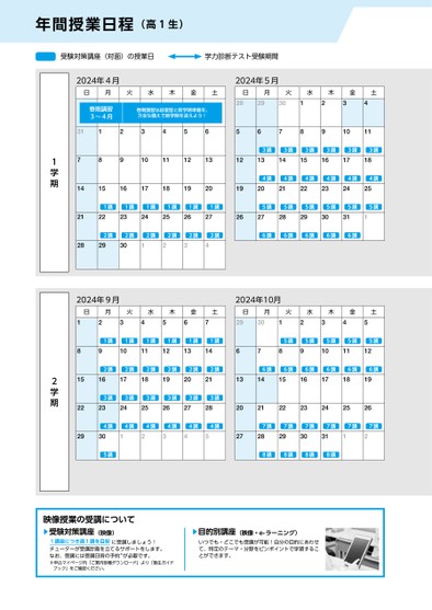 受験対策講座(対面)の授業日学力診断テスト受験期間年間授業日程(高1生)▶受験対策講座(映像)映像授業の受講についてなお、受講には受講日時の予約※が必要です。チューターが受講計画を立てるサポートをします。1講座につき週1講を目安に受講しましょう!※申込マイページ内「ご案内各種ダウンロード」より「塾生ガイドブック」をご確認ください。▶目的別講座(映像・e-ラーニング)て、特定のテーマ・分野をピンポイントで学習するこいつでも・どこでも受講が可能!自分の目的にあわせとができます。1学期2学期日月火水木金土3講3講3講3講3講3講4講4講4講4講4講4講5講5講5講5講5講5講6講6講6講6講6講2024年5月282930123456789101112131415161718192021222324252627282930311日月火水木金土1講1講1講1講1講1講2講2講2講2講2講2講3講3講3講3講3講3講4講4講4講4講4講4講5講2024年9月12345678910111213141516171819202122232425262728293012345日月火水木金土5講5講5講5講5講6講6講6講6講6講6講7講7講7講7講7講7講8講8講8講8講2024年10月29301234567891011121314151617181920212223242526272829303112日月火水木金土1講1講1講1講1講1講2講2講2講2講2講2講2024年4月311234567891011121314151617181920212223242526272829301234春期講習3~4月春期講習は総復習と新学期準備を。万全な備えで新学期を迎えよう!