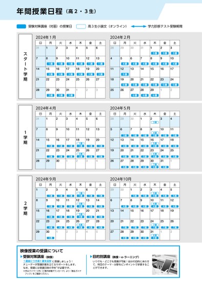 受験対策講座(対面)の授業日高3生小論文(オンライン)学力診断テスト受験期間年間授業日程(高2・3生)日月火水木金土1講1講1講1講1講1講2講2講2講2講2講2講3講3講3講2024年1月3112345678910111213141516171819202122232425262728293031123日月火水木金土3講3講3講4講4講4講4講4講4講5講6講5講5講5講5講5講6講6講6講2024年2月28293031123456789101112131415161718192021222324252627282912日月火水木金土1講1講1講1講1講1講1講2講2講2講2講2講2講2講2024年4月311234567891011121314151617181920212223242526272829301234スタート学期日月火水木金土3講2講3講3講3講4講3講3講3講4講4講4講5講4講4講4講5講5講5講6講5講5講5講6講6講6講6講7講6講2024年5月2829301234567891011121314151617181920212223242526272829303111学期日月火水木金土5講5講5講5講5講5講6講6講6講6講6講6講6講7講7講7講7講7講7講7講8講8講8講8講8講2024年10月29301234513141516171819202122232425262728293031122学期▶受験対策講座(映像)映像授業の受講についてなお、受講には受講日時の予約※が必要です。チューターが受講計画を立てるサポートをします。1講座につき週1講を目安に受講しましょう!※申込マイページ内「ご案内各種ダウンロード」より「塾生ガイドブック」をご確認ください。▶目的別講座(映像・e-ラーニング)て、特定のテーマ・分野をピンポイントで学習するこいつでも・どこでも受講が可能!自分の目的にあわせとができます。日月火水木金土1講1講1講1講1講1講1講2講2講2講2講2講2講2講3講3講3講3講3講3講3講4講4講4講4講4講4講4講5講2024年9月123456767891011128910111213141516171819202122232425262728293012345