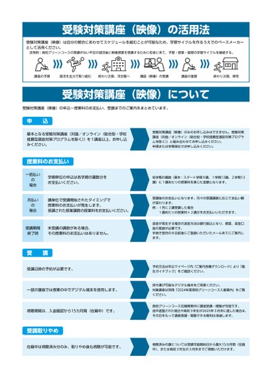受験対策講座(映像)の活用法受験対策講座(映像)は自分の都合にあわせてスケジュールを組むことが可能なため、学習サイクルを作るうえでのペースメーカーとして活用ください。活用例:高校グリーンコースの受講がない平日の部活後に映像授業を受講するために校舎に来て、予習・授業・復習の学習サイクルを継続する。講座の予習部活を全力で取り組む終わり次第、河合塾へ講座(映像)の受講講座の復習終わり次第、帰宅受験対策講座(映像)について受験対策講座(映像)の申込~授業料のお支払い、受講までのご案内をまとめています。申込基本となる受験対策講座(対面/オンライン〈総合型・学校推薦型選抜対策プログラムを除く〉)を1講座以上、お申し込みください。受験対策講座(映像)のみのお申し込みはできません。受験対策講座(対面/オンライン〈総合型・学校推薦型選抜対策プログラムを除く〉)と組み合わせてお申し込みください。年間または学期単位でお申し込みください。授業料のお支払い一括払いの場合学期単位の申込は各学期の講数分をお支払いください。各学期の講数(基本:スタート学期9講、1学期13講、2学期13講)に1講あたりの授業料を乗じた金額となります。月払いの場合講単位で受講開始されたタイミングで授業料のお支払いが発生します。受講された授業講数の授業料をお支払いください。受講期間終了時未受講の講数がある場合、その授業料のお支払いはありません。受講受講日時の予約が必要です。一部の講座では授業の中でデジタル端末を使用します。視聴期間は、入金確認から15カ月間(在籍中)です。受講取りやめ受講後のお支払いとなります。月々の受講講数に応じて支払い額が変わります。例:1月に2講受講した場合1講あたりの授業料×2講分をお支払いいただきます。返金が発生する場合の返金方法は銀行振込となり、都度、返金口座の登録が必要です。手続き翌月の8日前後にご登録いただいたメールあてにご案内します。予約方法は申込マイページ内「ご案内各種ダウンロード」より「塾生ガイドブック」をご確認ください。持ち運び可能なデジタル端末をご用意ください。対象講座は別冊「2024年度高校グリーンコース入塾案内」をご覧ください。高校グリーンコース在籍期間中に講座受講・閲覧が可能です。途中退塾された場合や高校3年生が2025年3月末に達した場合は、その日をもって講座受講・閲覧できる権利は消滅します。在籍中は視聴済み分のみ、取りやめ後も視聴が可能です。視聴済みの講については受講可能開始日から最大15カ月間(在籍中)、または高校3年生の3月末までご視聴いただけます。