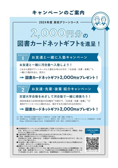 の※12024・2023年度に河合塾生ではなかった高校生が、「お友達・先輩・後輩」の対象です。※2河合塾生とは、大学受験科、高校グリーンコース、MEPLO、K会、中学グリーンコース、小学グリーンコース、河合塾NEXT、河合塾Wings、KAWAIJUKUEnglishSchool、河合塾美術研究所(本科・専科)、COSMOの在籍者です。●河合塾高校グリーンコースへの入塾申込時にご利用いただけるキャンペーンです。なお、本キャンペーンご利用には申込時にクーポンコードの入力が必要です。詳細は、Webサイトにてご確認ください。●入塾手続完了後のお申し出には応じられませんのであらかじめご了承ください。●ご兄弟・姉妹間でのキャンペーンご利用はできません。河合塾生のご兄弟・姉妹の方は、入塾金が一部免除される場合がありますので、詳しくは12ページをご覧ください。●「お友達と一緒に入塾キャンペーン」では、一緒にお申し込みされた2名以上が受講されなかった場合、本キャンペーンの適用となりません。◆図書カードネットギフトお渡し方法◆「お友達と一緒に入塾キャンペーン」では一緒にお申し込みされた2名以上の受講開始後、「お友達・先輩・後輩紹介キャンペーン」では紹介された方の受講開始後に図書カードネットギフトを送信いたします。なお、送信までには、受講開始後1〜2カ月程度かかる予定です。2024年度または2023年度の河合塾生※2の紹介で、「お友達・先輩・後輩」※1が高校グリーンコースに入塾されると、紹介する方と紹介される方双方に図書カードネットギフト2,000円分プレゼント!お友達・先輩・後輩紹介キャンペーンキャンペーン2志望大学合格をめざして河合塾で一緒に頑張ろう!これから高校グリーンコースに入塾をお考えの方が、「お友達・先輩・後輩」※1と一緒に入塾されると、双方に図書カードネットギフト2,000円分プレゼント!お友達と一緒に入塾キャンペーンキャンペーン1お友達と一緒に河合塾へ入塾しよう!キャンペーンのご案内2,000円分2024年度高校グリーンコース図書カードネットギフトを進呈!ご利用方法の詳細はこちらから2023/11/8水)公開