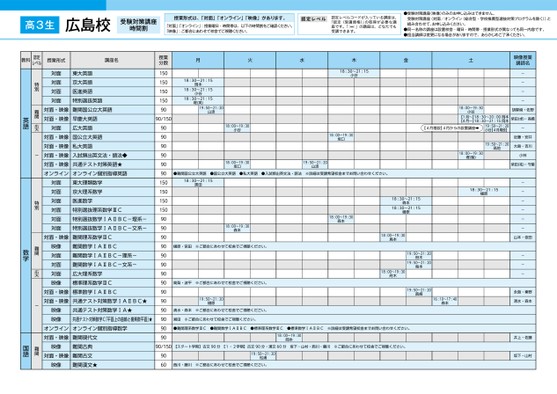 広島校高3生広島校受験対策講座時間割授業形式は、「対面」「オンライン」「映像」があります。認定レベル「対面」「オンライン」:授業曜日・時間帯は、以下の時間割をご確認ください。「映像」:ご都合にあわせて校舎でご視聴ください。認定レベルコードが入っている講座は、「認定(受講資格)」の取得が必要な講座です。「」の講座は、どなたでも受講できます。ー●受験対策講座(映像)のみのお申し込みはできません。受験対策講座(対面/オンライン〈総合型・学校推薦型選抜対策プログラムを除く〉)と組み合わせて、お申し込みください。●同一名称の講座は設置校舎・曜日・時間帯・授業形式が異なっても同一内容です。●担当講師は変更になる場合がありますので、あらかじめご了承ください。18:00〜19:30小谷【1月〜】18:30〜20:00岡本【4月〜】18:30〜21:15岡本19:50〜21:20小谷【4月増設】【4月増設】4月からの設置講座➡19:50〜21:20髙地18:00〜19:30堤(智)18:30〜21:15原月火水18:30〜21:15岡本小谷18:30〜21:1518:30〜21:15堤(英)19:50〜21:20山添木18:30〜21:15小谷金土18:00〜19:30小谷18:00〜19:30坂口18:00〜19:30坂口19:50〜21:20山添●難関国公立大英語●国公立大英語●私大英語●入試頻出英文法・語法※詳細は受講希望校舎までお問い合わせください。18:30〜21:15黒田18:00〜19:30森本18:00〜19:30森本原・宮田※ご都合にあわせて校舎でご視聴ください。高梨・波平※ご都合にあわせて校舎でご視聴ください。19:50〜21:20原清水・森本※ご都合にあわせて校舎でご視聴ください。湘田※ご都合にあわせて校舎でご視聴ください。18:30〜21:1518:30〜21:15森本原18:00〜19:30鳥本18:00〜19:30府木19:50〜21:2019:50〜21:20府木鳥本19:50〜21:20真崎16:10〜17:40森本●難関理系数学ⅢC●難関数学ⅠAⅡBC●標準理系数学ⅢC●標準数学ⅠAⅡBC※詳細は受講希望校舎までお問い合わせください。【スタート学期】古文90分【1・2学期】古文90分・漢文60分坂下・山村・西川・藤川※ご都合にあわせて校舎でご視聴ください。18:00〜19:30岡本西川・藤川※ご都合にあわせて校舎でご視聴ください。19:50〜21:20松浦映像授業映像授業講師名----胡摩﨑・佐野柴田(卓)・髙橋-近藤・安井大島・吉川小林柴田(祐)・守屋------山本・依田---永島・秦野清水・森本井上・佐藤坂下・山村授業分数1501501501509090/150909090909090150150150150909090909090909090909090909090/1509060対面対面対面対面対面・映像対面・映像対面対面・映像対面・映像対面・映像対面・映像オンライン対面対面対面対面対面対面対面・映像映像対面対面対面映像対面・映像対面・映像映像映像オンライン対面・映像映像対面・映像映像東大英語京大英語医進英語特別選抜英語難関国公立大英語早慶大英語広大英語国公立大英語私大英語入試頻出英文法・語法◆共通テスト対策英語★オンライン個別指導英語東大理類数学京大理系数学医進数学特別選抜理系数学ⅢC特別選抜数学ⅠAⅡBC-理系-特別選抜数学ⅠAⅡBC-文系-難関理系数学ⅢC難関数学ⅠAⅡBC難関数学ⅠAⅡBC-理系-難関数学ⅠAⅡBC-文系-広大理系数学標準理系数学ⅢC標準数学ⅠAⅡBC共通テスト対策数学ⅠAⅡBC★共通テスト対策数学ⅠA★共通テスト対策数学C「平面上の曲線と複素数平面」★オンライン個別指導数学難関現代文難関古典難関古文難関漢文★特別難関広大-特別難関広大-英語数学難関国語認定教科申認定レベルレベル授業形式区分コード講座名1ページ●2024年度/51/広島/広島校/高3・卒生/パターン6614/2024_51_6_611_11_20230831085126.csv校了時削除広島校広島校3ペ3ペ