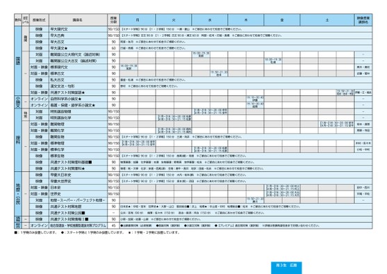 講座名講座名授業分数授業分数月月火火水水木木金金土土90/150910【スタート学期】90分【1・2学期】150分【スタート学期】0分【1・2学期】0分一瀬・菱山一瀬・菱山※ご都合にあわせて校舎でご視聴ください。※ご都合にあわせて校舎でご視聴ください。90/150910【スタート学期】古文90分【1・2学期】古文90分・漢文60分【スタート学期】古文0分【1・2学期】古文0分・漢文0分阿部・佐河・打越・髙橋阿部・佐河・打越・髙橋※ご都合にあわせて校舎でご視聴ください。※ご都合にあわせて校舎でご視聴ください。映像授業映像授業映像授業講師名----青木・奥村青木・奥村近藤・菅井近藤・菅井19:50〜21:20岡本・岩本・寺田19:50〜:20・岩本・寺田伊藤・江・福永伊藤・江・福永【1月〜】18:30〜20:00安平【4月〜】18:30〜21:15安平【1月〜】80〜0:0安平【4月〜】80〜1:5安平--------坂本・渡部坂本・渡部青野・寺田青野・寺田木村・佐々木木村・佐々木小松・中村小松・中村田中・西川田中・西川平尾・平松平尾・平松--阿部・佐河阿部・佐河※ご都合にあわせて校舎でご視聴ください。※ご都合にあわせて校舎でご視聴ください。打越・髙橋打越・髙橋※ご都合にあわせて校舎でご視聴ください。※ご都合にあわせて校舎でご視聴ください。18:00〜19:3018:00〜:30三石三石18:00〜19:3018:00〜:30莵原莵原重盛・松浦重盛・松浦※ご都合にあわせて校舎でご視聴ください。※ご都合にあわせて校舎でご視聴ください。野村野村※ご都合にあわせて校舎でご視聴ください。※ご都合にあわせて校舎でご視聴ください。19:50〜21:2019:50〜:20岩本岩本90906060909090909090909090909090909090909090【1月〜】18:30〜20:00安平【4月〜】18:30〜21:15安平【1月〜】80〜0:0安平【4月〜】80〜1:5安平【1月〜】18:30〜20:00松原【4月〜】18:30〜21:15松原【1月〜】80〜0:0松原【4月〜】80〜1:5松原18:00〜19:3018:00〜:30松浦松浦19:10〜20:4019:10〜:4019:10〜20:4019:10〜:40伊藤伊藤加賀加賀【1月〜】18:30〜20:00岡内【4月〜】18:30〜21:15岡内【1月〜】1:〜2:0岡内【4月〜】1:〜2:1岡内三浦・向井三浦・向井【スタート学期】90分【1・2学期】150分【1月〜】18:30〜20:00安平【4月〜】18:30〜21:15安平【スタート学期】0分【1・2学期】0分【1月〜】80〜0:0安平【4月〜】80〜1:5安平※ご都合にあわせて校舎でご視聴ください。※ご都合にあわせて校舎でご視聴ください。90/15091090/150910【スタート学期】90分【1・2学期】150分【スタート学期】0分【1・2学期】0分【1月〜】18:30〜20:00松原【4月〜】18:30〜21:15松原【1月〜】80〜0:0松原【4月〜】80〜1:5松原西尾(健)・牧島西尾(健)・牧島※ご都合にあわせて校舎でご視聴ください。※ご都合にあわせて校舎でご視聴ください。90909090物理基礎:加藤物理基礎:加藤化学基礎:本瀬化学基礎:本瀬生物基礎:野黒美生物基礎:野黒美地学基礎:松永地学基礎:松永※ご都合にあわせて校舎でご視聴ください。※ご都合にあわせて校舎でご視聴ください。物理:乾・大學物理:乾・大學化学:安達・西尾(源)化学:安達・西尾(源)生物:唐牛・長井生物:唐牛・長井地学:田島・松永地学:田島・松永※ご都合にあわせて校舎でご視聴ください。※ご都合にあわせて校舎でご視聴ください。90/150910【スタート学期】90分【1・2学期】150分【スタート学期】0分【1・2学期】0分90/150910【スタート学期】90分【1・2学期】150分【スタート学期】0分【1・2学期】0分大内・坂本(勝)大内・坂本(勝)※ご都合にあわせて校舎でご視聴ください。※ご都合にあわせて校舎でご視聴ください。坂本(新)・沼田坂本(新)・沼田※ご都合にあわせて校舎でご視聴ください。※ご都合にあわせて校舎でご視聴ください。日本史★:中垣・宮本日本史★:中垣・宮本世界史★:大野・山口世界史★:大野・山口歴史総合■:井上歴史総合■:井上地理★:中土居・中村地理★:中土居・中村地理総合■:松本地理総合■:松本公共:吉見(90分)公共:吉見(0分)倫理:佐々木(150分)倫理:佐々木(0分)政治・経済:河合(150分)政治・経済:河合(0分)※ご都合にあわせて校舎でご視聴ください。※ご都合にあわせて校舎でご視聴ください。小野・加賀・佐藤・山家小野・加賀・佐藤・山家※ご都合にあわせて校舎でご視聴ください。※ご都合にあわせて校舎でご視聴ください。●出願書類対策(必須受講)●出願書類対策(必須受講)●面接対策(選択制)●面接対策(選択制)●小論文対策(選択制)●小論文対策(選択制)●【プレミアム】過去問対策(選択制)※詳細は受講希望校舎までお問い合わせください。●【プレミアム】過去問対策(選択制)※詳細は受講希望校舎までお問い合わせください。【1月〜】18:30〜20:00村上【4月〜】18:30〜21:15村上【1月〜】18:30〜20:00大元【4月〜】18:30〜21:15大元【1月〜】80〜0:0村上【4月〜】80〜1:5村上【1月〜】80〜0:0大元【4月〜】80〜1:5大元19:50〜21:2019:50〜:20瀬川瀬川※ご都合にあわせて校舎でご視聴ください。※ご都合にあわせて校舎でご視聴ください。早大現代文早大古典早大古文早大漢文★難関国公立大現代文(論述対策)難関国公立大古文(論述対策)標準現代文標準古文私大古文漢文文