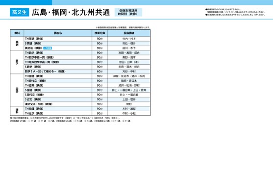高2生広島・福岡・北九州共通受験対策講座時間割(映像)●映像授業のみのお申し込みはできません。受験対策講座(対面/オンライン)と組み合わせて、お申し込みください。●担当講師は変更になる場合がありますので、あらかじめご了承ください。※映像授業は対面授業と授業講数、授業内容が異なります。担当講師竹内・村上市位・横井成川・木下宮田・湘田・成合秦野・鳥本依田・山本(洋)永島・清水・成合刈谷・中村篠原・佐佐木・酒井・松浦篠原・佐佐木酒井・松浦・野村井上・一番合戦・上田・菅井井上・一番合戦上田・菅井野村木村・渡部中村・小松講座名授業分数TH英語(映像)S英語(映像)英文法(映像)4月開講TH数学(映像)TH数学中高一貫(映像)TH理系数学中高一貫(映像)S数学(映像)数学ⅠA-知って極める-(映像)TH国語(映像)TH現代文(映像)TH古典(映像)S国語(映像)S現代文(映像)S古文(映像)漢文文法・句形(映像)TH物理(映像)TH化学(映像)90分90分90分90分90分90分90分60分90分90分90分90分90分90分90分90分90分教科英語数学国語理科高2生の映像授業は、以下の単位でお申し込みが可能です(「数学ⅠA-知って極める-」「漢文文法・句形」を除く)。[年間講数29講]:①11講②11講③7講、[年間講数26講]:①13講②13講、[年間講数22講]:①11講②11講