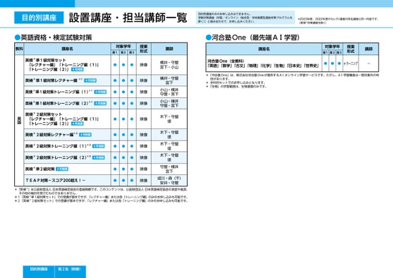 目的別講座設置講座・担当講師一覧目的別講座のみのお申し込みはできません。受験対策講座(対面/オンライン〈総合型・学校推薦型選抜対策プログラムを除く〉)と組み合わせて、お申し込みください。*2023年度、2022年度のセレクト講座の同名講座と同一内容です。(英検対策講座を除く)●河合塾One(最先端AⅠ学習)講座名対象学年高1高2高3授業形式講師河合塾One(全教科)「英語」「数学」「古文」「物理」「化学」「生物」「日本史」「世界史」●●●e-ラーニング-*「河合塾One」は、株式会社河合塾Oneが提供するAⅠオンライン学習サービスです。ただし、AⅠ学習機能は一部対象外の科目があります。全科目セットでのお申し込みとなります。**「生物」の学習範囲は、生物基礎のみです。講師横井・守屋宮下・小山横井・守屋宮下小山・横井守屋・宮下小山・横井守屋・宮下木下・守屋堤木下・守屋堤木下・守屋堤木下・守屋堤守屋・横井宮下成川・森(千)安井・守屋対象学年高1高2高3授業形式●●●映像●●●●●●●●●映像映像映像●●●映像●●●●●●●●●●●●●●●映像映像映像映像映像英検®準1級対策セット「レクチャー編」「トレーニング編(1)」「トレーニング編(2)」4月開講英検®準1級対策レクチャー編※14月開講英検®準1級対策トレーニング編(1)※14月開講英検®準1級対策トレーニング編(2)※14月開講英検®2級対策レクチャー編※24月開講英検®2級対策トレーニング編(1)※24月開講英検®2級対策トレーニング編(2)※24月開講英検®準2級対策4月開講TEAP対策-スコア200超え!-英検®2級対策セット「レクチャー編」「トレーニング編(1)」「トレーニング編(2)」4月開講英語●英語資格・検定試験対策教科講座名*「英検®」は公益財団法人日本英語検定協会の登録商標です。このコンテンツは、公益財団法人日本英語検定協会の承認や推奨、その他の検討を受けたものではありません。※1「英検®準1級対策セット」での受講が基本ですが、「レクチャー編」または各「トレーニング編」のみのお申し込みも可能です。※2「英検®2級対策セット」での受講が基本ですが、「レクチャー編」または各「トレーニング編」のみのお申し込みも可能です。目的別講座高2生(映像)高3生北九州高2生北九州高1生北九州高3生福岡高2生福岡高1生福岡高3生広島高2生広島高1生広島