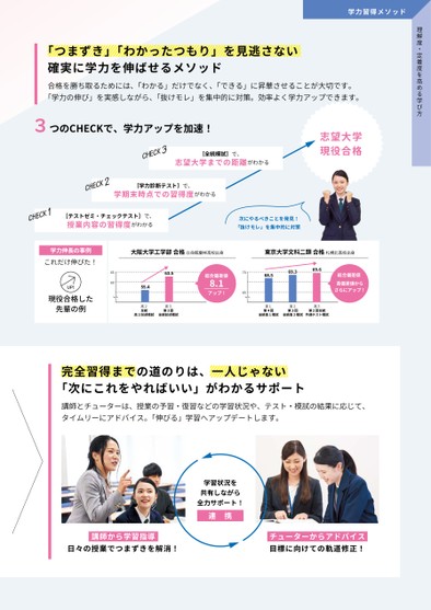 理解度・定着度を高める学び方学力習得メソッド「つまずき」「わかったつもり」を見逃さない確実に学力を伸ばせるメソッド合格を勝ち取るためには、「わかる」だけでなく、「できる」に昇華させることが大切です。「学力の伸び」を実感しながら、「抜けモレ」を集中的に対策。効率よく学力アップできます。3つのCHECKで、学力アップを加速!CHECK3[全統模試]で、志望大学までの距離がわかる志望大学現役合格CHECK2[学力診断テスト]で、学期末時点での習得度がわかるCHECK1[テストゼミ・チェックテスト]で、授業内容の習得度がわかる次にやるべきことを発見!「抜けモレ」を集中的に対策学力伸長の事例これだけ伸びた!UP!現役合格した先輩の例大阪大学工学部合格立命館慶祥高校出身東京大学文科二類合格札幌北高校出身������.���.�高2全統高2記述模試高3第3回全統記述模試総合偏差値�.�アップ!������.���.���.�総合偏差値高偏差値からさらにアップ!高1第4回全統高1模試高2第3回全統高2模試高3第2回全統共通テスト模試完全習得までの道のりは、一人じゃない「次にこれをやればいい」がわかるサポート講師とチューターは、授業の予習・復習などの学習状況や、テスト・模試の結果に応じて、タイムリーにアドバイス。「伸びる」学習へアップデートします。学習状況を共有しながら全力サポート!連携チューターからアドバイス目標に向けての軌道修正!講師から学習指導日々の授業でつまずきを解消!