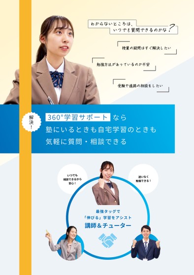 わからないところは、いつでも質問できるのかな?授業の疑問はすぐ解決したい勉強方法があっているのか不安受験や進路の相談をしたい相談できるからいつでも安心!迷いなく勉強できる!���°学習サポートなら塾にいるときも自宅学習のときも気軽に質問・相談できる解決!最強タッグで「伸びる」学習をアシスト講師&チューター