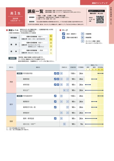 受験対策講座﹇高�生﹈講座ラインアップWebサイトへアクセス!講座を探す・申し込む2023/11/8(水)公開高1生2024年4月スタート講座一覧受験対策講座(映像)のみのお申し込みはできません。受験対策講座(対面/オンライン)と組み合わせてお申し込みください。授業講数授業時間1学期:13講、2学期:13講〈年間26講〉※一部講座を除く。授業日程は別冊「入塾要項」をご確認ください。※1学期:4〜7月/2学期:9月〜12月下記に記載の授業時間に休憩時間は含みません。※100分を超える授業には途中休憩があります。2025年1月から新年度(高2生)のカリキュラムが開講します。講座ラインアップなどは2024年秋よりご案内します。●マーク:採点・添削あり:英語4技能を養う:対面授業:映像授業:オンライン授業(個別)詳しくは44ページをご覧ください。563412特別選抜難関標準受講の目安偏差値65.0〜目標大学:東大・京大・医学部医学科受講の目安偏差値55.0〜目標大学:北大をはじめとする難関国公立大・早慶大など受講の目安偏差値〜55.0目標大学:国公立大・私立大認定制「認定制」講座の受講には認定が必要です。マークのない講座はどなたでも受講できます。認定の取得方法は、入塾要項の3・4ページをご覧ください。●講座レベル数字が大きいほど難度が高く、入試難易度の高い大学をめざす方向けの講座です。※受講の目安偏差値は、河合塾全統模試における偏差値教科名講座名授業形式授業時間年間講数標準難関1234特別選抜56講座レベル認定制特別選抜英語難関英語標準英語英文法※1認定制特別選抜数学難関数学難関数学中高一貫標準数学難関・標準国語漢文文法・句形※2英語数学国語※1高2の同名講座と同一内容です。※2高2・高3の同名講座と同一内容です。150分90分90分90分150分90分90分90分90分90分26講26講26講26講26講26講26講26講26講9講