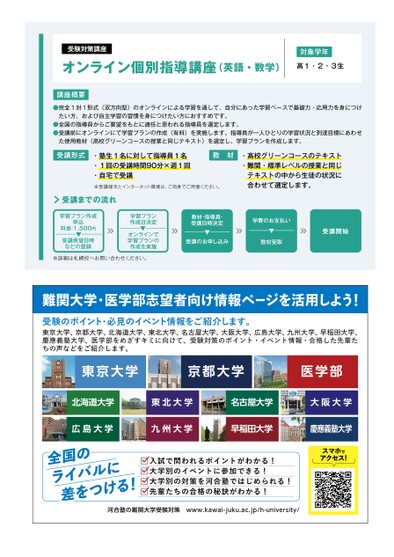 受験対策講座オンライン個別指導講座(英語数学)対象学年高1・2・3生講座概要●完全1対1形式(双方向型)のオンラインによる学習を通して、自分にあった学習ペースで基礎力・応用力を身につけたい方、および自主学習の習慣を身につけたい方におすすめです。●全国の指導員からご要望をもとに適任と思われる指導員を選定します。●受講前にオンラインにて学習プランの作成(有料)を実施します。指導員が一人ひとりの学習状況と到達目標にあわせた使用教材(高校グリーンコースの授業と同じテキスト)を選定し、学習プランを作成します。受講形式・塾生1名に対して指導員1名・1回の受講時間90分×週1回・自宅で受講教材※受講端末とインターネット環境は、ご自身でご用意ください。・高校グリーンコースのテキスト・難関・標準レベルの授業と同じテキストの中から生徒の状況に合わせて選定します。受講までの流れ学習プラン作成申込料金:1,500円受講希望日時などの登録学習プラン作成日決定オンラインで学習プランの作成を実施教材・指導員・受講日時決定学費のお支払い受講のお申し込み教材受取受講開始※詳細は札幌校へお問い合わせください。難関大学・医学部志望者向け情報ページを活用しよう!受験のポイント・必見のイベント情報をご紹介します。東京大学、京都大学、北海道大学、東北大学、名古屋大学、大阪大学、広島大学、九州大学、早稲田大学、慶應義塾大学、医学部をめざすキミに向けて、受験対策のポイント・イベント情報・合格した先輩たちの声などをご紹介します。東京大学京都大学医学部北海道大学東北大学名古屋大学大阪大学広島大学九州大学早稲田大学慶應義塾大学全国のライバルに差をつける!入試で問われるポイントがわかる!大学別のイベントに参加できる!大学別の対策を河合塾ではじめられる!先輩たちの合格の秘訣がわかる!スマホでアクセス!河合塾の難関大学受験対策www.kawai-juku.ac.jp/h-university/