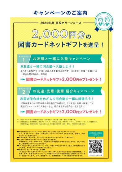 2023年度難関大合格実績キャンペーンのご案内桁違いの合格実績!これが、河合塾2024年度高校グリーンコース圧倒的難関国立大計8,148名2,000円分の北海道大学▶東京大学▶京都大学▶北海道大学▶東北大学▶東京工業大学▶一橋大学………1,321名………1,377名………648名…………671名……253名…………366名図書カードネットギフトを進呈!医学部医学科※2計4,204名▶名古屋大学▶大阪大学▶神戸大学▶広島大学▶九州大学………845名…………685名…………640名…………621名…………721名※1648名キャンペーンまだまだあります!1合格実績・合格者の声▶▶▶お友達と一緒に入塾キャンペーンの中でNo.�(オルフェウスコンサルティング株式会社調べ)。※1����年度合格実績をWebサイト・パンフレットに公表している予備校※2国公立大学医学部医学科計と私立大学医学部医学科計の合計です。*この合格実績は、����年度入試における河合塾グループ関連法人の生徒の合格状況についてまとめたものです。各大学の合格者数は、河合塾グループ関連法人の在籍者および講習受講生の集計であり、公開模試のみの受験生は含まれていません。ただし一人で複数の大学・学部・学科に合格した場合は、それぞれに合格者として計上しています。お友達と一緒に河合塾へ入塾しよう!CONTENTSこれから高校グリーンコースに入塾をお考えの方が、「お友達・先輩・後輩」※一緒に入塾されると、双方に1とキャンペーン2図書カードネットギフト2,000円分プレゼント!学年表示について����年度河合塾高校グリーンコースにおける学年(在籍期間)は以下のとおりです。●高1生:����年4月~��月末日●高2生:����年1月~��月末日●高3生:����年1月~����年3月末日※学校の学年(在学期間)とは異なりますのでご注意ください。お友達・先輩・後輩紹介キャンペーン講座ラインアップデジタル端末の使用について……志望大学合格をめざして河合塾で一緒に頑張ろう!講座選びのSTEP……………………Webで検索!………………………講座一覧……………………………2024年度または2023年度の河合塾生※2高校グリーンコースに入塾されると、紹介する方と紹介される方双方にの紹介で、「お友達・先輩・後輩」※1図書カードネットギフト2,000円分プレゼント!������������������が●合格者インタビュー●まずは知りたい!河合塾での1日/1年●合格に直結!新課程入試を勝ち抜く「最短ルート」学力習得メソッド●理解度・定着度を高める学び方●採点・添削指導�to�合格戦略カリキュラム●ぴったりな学習プラン●志望にあわせた徹底的な入試対策���°学習サポート●質問・相談●学習環境●グッド学習サイクル●欠席フォロー/保護者の方へ●テキスト・教材●学力を伸ばす仕組み●河合塾の講師・授業サイトにてご確認ください。��●受験・進学指導●塾生特典河合塾校グリーンコースへの入塾申込時にご利用いただけるキャンペーンです。なお、本キャンペーンご利用には申込時にクーポンコードの入力が必要です。詳細は、Web●入塾手続完了後のお申し出には応じられませんのであらかじめご了承ください。●ご兄弟・姉妹間でのキャンペーンご利用はできません。河合塾生のご兄弟・姉妹の方は、入塾金が一部免除される場合がありますので、詳しくは別冊「入塾要項」12ページをご覧ください。●「お友達と一緒に入塾キャンペーン」では、一緒にお申し込みされた2名以上が受講されなか※12024・2023年度に河合塾生ではなかった高校生が、「お友達・先輩・後輩」の対象です。※2河合塾生とは、大学受験科、高校グリーンコース、MEPLO、K会、中学グリーンコース、小学グリーンコース、河合塾NEXT、河合塾Wings、KAWAIJUKUEnglishSchool、河合塾美術研究所(本科・専科)、COSMOの在籍者です。河合塾高校グリーンコース��講座の内容は、Webサイトへ!2023/11/8(水)公開動画でカンタン理解!河合塾の特長ご利用方法の詳細はこちらから2023/11/8(水)公開「新型コロナウイルスへの感染予防・拡大防止」に関する河合塾の取り組みについては、河合塾Webサイトに最新情報を掲載いたします。った場合、本キャンペーンの適用となりません。◆図書カードネットギフトお渡し方法◆「お友達と一緒に入塾キャンペーン」では一緒にお申し込みされた2名以上の受講開始後、「お友達・先輩・後輩紹介キャンペーン」では紹介された方の受講開始後に図書カードネットギフトを送信いたします。なお、送信までには、受講開始後1〜2カ月程度かかる予定です。2023/11/8(水)公開