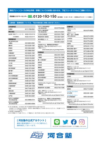 高校グリーンコースの申込手続・学費についてのお問い合わせは、下記フリーダイヤルにご連絡ください。河合塾カスタマーセンター0120-19●2-15●0(受付時間12:00〜19:30※日祝および12/31〜1/3を除く)入塾相談・受講相談については、下記の各校舎にお問い合わせください。(011)708-8581北海道地区札幌校東北地区仙台校(高校グリーンコース)(022)215-5112(022)215-5111(大学受験科)首都圏地区〈東大専門特化校舎〉本郷校麹町校新宿校池袋校秋葉原館*自由が丘校吉祥寺現役館*調布現役館*立川校町田校厚木現役館*藤沢館*横浜校あざみ野現役館*金沢文庫現役館*大宮校南浦和現役館*川越現役館*柏校津田沼校千葉現役館*水戸校MEPLO池袋教室*(東大現役進学塾)MEPLO本郷教室(東大現役進学塾)(03)5803-0581(03)3230-1581(03)3362-6581(03)3988-0581(03)5825-1581(03)5726-3261(0422)23-6581(042)440-2581(042)526-0581(042)724-7581(046)227-6581(0466)50-2581(045)312-6581(045)905-2581(045)782-7581(048)647-0581(048)884-7581(049)229-1005(04)7168-2271(047)473-7581(043)241-3581(029)302-6581(03)3988-6731(03)5803-0584MEPLO表参道教室*(東大現役進学塾)MEPLO横浜教室*(東大現役進学塾)COSMO東京校美術研究所新宿校海外帰国生コースK会(03)5778-9480(045)316-6581(03)5331-7581(03)3367-2581(03)3830-1371(03)3813-4581www.kawai-juku.ac.jp/winɡs/kanto/河合塾Winɡs(難関高校進学教室)*教室所在地・お問い合わせ先はWebサイトにてご確認ください。中部地区名駅校千種校星ヶ丘現役館*岐阜校浜松校豊橋校刈谷現役館*岡崎現役館*豊田現役館*四日市現役館*津現役館*(052)451-0581(052)735-1588(052)782-0581(058)264-5581(053)453-5581(0532)54-0581(0566)21-3581(0564)54-3581(0565)32-5581(059)350-4581(059)226-0581KAWAIJUKUEnɡlishSchool千種教室(052)735-1587美術研究所名古屋校(052)735-1596小学・中学グリーンコース教室所在地・お問い合わせ先はWebサイトにてご確認ください。www.kawai-juku.ac.jp/jhɡreen/tokai/河合塾Winɡs(難関公立高校進学教室)*教室所在地・お問い合わせ先はWebサイトにてご確認ください。www.kawai-juku.ac.jp/winɡs/tokai/※(学)河合塾主催。*の校舎は(株)河合塾進学研究社主催の校舎です。河合塾マナビス各校舎の主催者は、各校舎へ直接お電話などでお問い合わせいただくか、河合塾マナビスのWebサイトでご確認ください。※「現役館」は登録商標です。※おかけ間違いにご注意ください。ⅠP電話など一部ご利用になれない場合があります。近畿地区大阪北キャンパス大阪校大阪北キャンパス東大・京大・医進館(高卒生専用校舎)上本町校天王寺校京都校神戸三宮校現役生教室豊中*現役生教室高槻*現役生教室堺東*現役生教室岸和田*現役生教室西大寺*現役生教室八木*サポートコース梅田(06)6375-8581(06)6372-3592(06)6774-2581(06)6776-0581(075)252-0581(078)251-1715(06)6842-3581(072)686-6788(072)225-6072(072)436-8581(0742)30-0581(0744)29-3581(06)6372-5124中学グリーンコース校舎所在地・お問い合わせ先はWebサイトにてご確認ください。www.kawai-juku.ac.jp/jhɡreen/kinki/中四国地区広島校(082)263-8581中学グリーンコース校舎所在地・お問い合わせ先はWebサイトにてご確認ください。www.kawai-juku.ac.jp/jhɡreen/hiroshima/九州地区福岡校2024年3月31日まで北九州校2024年4月1日から北九州現役館*(092)714-0581(093)581-2581(093)330-6581中学グリーンコース校舎所在地・お問い合わせ先はWebサイトにてご確認ください。www.kawai-juku.ac.jp/jhɡreen/fukuoka/河合塾マナビス校舎所在地はWebサイトにてご確認ください。www.manavis.com/(03)3512-5771最新の教育情報やイベントのご案内など、随時発信してまいります。※※2023年7月23日時点の正式名称・ロゴで掲載しております。