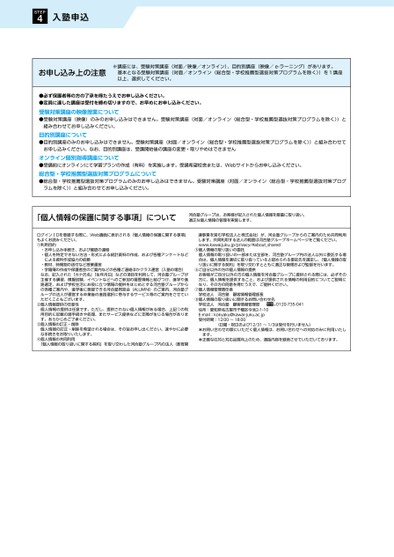 4STEP入塾申込お申し込み上の注意※講座には、受験対策講座(対面/映像/オンライン)、目的別講座(映像/e-ラーニング)があります。基本となる受験対策講座(対面/オンライン〈総合型・学校推薦型選抜対策プログラムを除く〉)を1講座以上、選択してください。●必ず保護者等の方の了承を得たうえでお申し込みください。●定員に達した講座は受付を締め切りますので、お早めにお申し込みください。受験対策講座の映像授業について●受験対策講座(映像)のみのお申し込みはできません。受験対策講座(対面/オンライン〈総合型・学校推薦型選抜対策プログラムを除く〉)と組み合わせてお申し込みください。目的別講座について●目的別講座のみのお申し込みはできません。受験対策講座(対面/オンライン〈総合型・学校推薦型選抜対策プログラムを除く〉)と組み合わせてお申し込みください。なお、目的別講座は、受講開始後の講座の変更・取りやめはできませんオンライン個別指導講座について●受講前にオンラインにて学習プランの作成(有料)を実施します。受講希望校舎または、Webサイトからお申し込みください。総合型・学校推薦型選抜対策プログラムについて●総合型・学校推薦型選抜対策プログラムのみのお申し込みはできません。受験対策講座(対面/オンライン〈総合型・学校推薦型選抜対策プログラムを除く〉)と組み合わせてお申し込みください。「個人情報の保護に関する事項」について河合塾グループは、お客様が記入された個人情報を厳重に取り扱い、適正な個人情報の管理を実施します。ログインⅠDを登録する際に、Web画面に表示される「個人情報の保護に関する事項」もよくお読みください。①利用目的・お申し込み手続き、および確認の連絡・個人を特定できない方法・形式による統計資料の作成、および各種アンケートなどによる資料作成協力の依頼・教材、時間割の送付など授業運営・学籍簿の作成や保護者会のご案内などの各種ご連絡ほかクラス運営(入塾の場合)なお、記入された「カナ氏名」「生年月日」などの項目を利用して、河合塾グループが主催する講習、模擬試験、イベントなどへのご参加の履歴情報と結びつけ、進学や進路選定、および学校生活にお役に立つ情報の提供をはじめとする河合塾グループからの各種ご案内や、進学後に登録できる河合塾同窓会(ALUMNI)のご案内、河合塾グループの法人が運営する卒業後の進路選択に寄与するサービス等のご案内をさせていただくこともございます。②個人情報提供の任意性個人情報の提供は任意です。ただし、提供されない個人情報がある場合、上記①の利用目的に記載の諸手続きや処理、またサービス提供などに支障が生じる場合があります。あらかじめご了承ください。③個人情報の訂正・削除個人情報の訂正・削除を希望される場合は、その旨お申し出ください。速やかに必要な手続きをお取りいたします。④個人情報の共同利用「個人情報の取り扱いに関する契約」を取り交わした河合塾グループ内の法人(教育関します。共同利用する法人の範囲は河合塾グループホームページをご覧ください。連事業を営む学校法人と株式会社)が、河合塾グループからのご案内のため共同利用www.kawaijuku.jp/privacy/#about_shared⑤個人情報の取り扱いの委託個人情報の取り扱いの一部または全部を、河合塾グループ内の法人以外に委託する場合は、個人情報を適切に取り扱っていると認められる委託先を選定し、「個人情報の取り扱いに関する契約」を取り交わすとともに適正な管理および監督を行います。⑥ご自分以外の方の個人情報の提供お客様がご自分以外の方の個人情報を河合塾グループに提供される際には、必ずその方に、個人情報を提供すること、および提供される情報の利用目的についてご説明になり、その方の同意を得たうえで、ご提供ください。⑦個人情報管理責任者学校法人河合塾顧客情報管理部長⑧個人情報の取り扱いに関するお問い合わせ先学校法人河合塾顧客情報管理部住所:愛知県名古屋市千種区今池2-1-10E-mail:kokyaku@kawai-juku.ac.jp受付時間:12:00〜18:000120-735-041(日曜・祝日および12/31〜1/3は受付を行いません)お問い合わせの際にいただく個人情報は、お問い合わせへの対応のみに利用いたし正確な応対と対応品質向上のため、通話内容を録音させていただいております。ます。