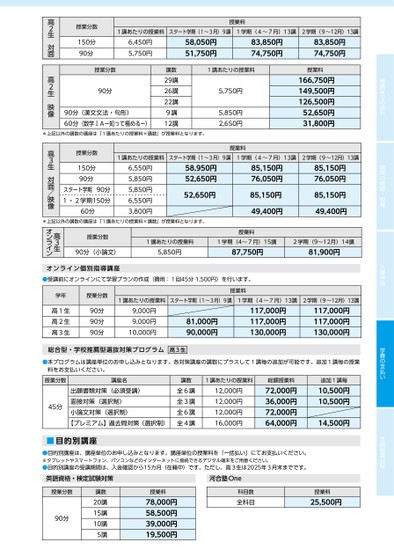 受講までの流れ認定の確認・取得入塾申込学費の支払い年間授業日程1講あたりの授業料スタート学期(1~3月)9講1学期(4~7月)13講2学期(9~12月)13講6,550円5,850円5,850円6,550円3,800円58,950円52,650円52,650円85,150円76,050円85,150円49,400円授業料85,150円76,050円85,150円49,400円*上記以外の講数の講座は「1講あたりの授業料×講数」が授業料となります。90分(小論文)5,850円87,750円81,900円1講あたりの授業料1学期(4~7月)15講2学期(9~12月)14講オンライン個別指導講座●受講前にオンラインにて学習プランの作成(費用:1回45分1,500円)を行います。学年授業分数高1生高2生高3生90分90分90分授業料1講あたりの授業料スタート学期(1~3月)9講1学期(4~7月)13講2学期(9~12月)13講9,000円9,000円10,000円81,000円90,000円117,000円117,000円130,000円117,000円117,000円130,000円総合型・学校推薦型選抜対策プログラム高3生●本プログラムは講座単位のお申し込みとなります。各対策講座の講数にプラスして1講毎の追加が可能です。追加1講毎の授業料をお支払いください。授業分数講座名出願書類対策(必須受講)面接対策(選択制)小論文対策(選択制)45分【プレミアム】過去問対策(選択制)講数全6講全3講全6講全4講1講あたりの授業料12,000円12,000円12,000円16,000円総額授業料72,000円36,000円72,000円64,000円追加1講毎10,500円10,500円14,500円■目的別講座●目的別講座は、講座単位のお申し込みとなります。講座単位の授業料を「一括払い」にてお支払いください。※タブレットやスマートフォン、パソコンなどのインターネットに接続できるデジタル端末をご用意ください。●目的別講座の受講期間は、入金確認から15カ月(在籍中)です。ただし、高3生は2025年3月末までです。英語資格・検定試験対策河合塾One授業分数90分講数20講15講10講5講授業料78,000円58,500円39,000円19,500円科目数全科目授業料25,500円授業分数150分90分授業分数90分高2生対面高2生映像授業分数150分90分スタート学期90分1・2学期150分60分高3生対面/映像授業分数高3生オンライン授業料1講あたりの授業料スタート学期(1~3月)9講1学期(4~7月)13講2学期(9~12月)13講6,450円5,750円58,050円51,750円83,850円74,750円83,850円74,750円90分(漢文文法・句形)60分(数学ⅠAー知って極めるー)*上記以外の講数の講座は「1講あたりの授業料×講数」が授業料となります。講数29講26講22講9講12講1講あたりの授業料5,750円5,850円2,650円授業料授業料166,750円149,500円126,500円52,650円31,800円