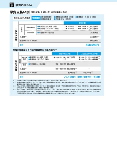 円円204,750204,75025,500円33,000円※190,090円558,090円5STEP学費の支払い学費支払い例〈2024/1/8(月・祝)までにお申し込み〉高3生Aさんの場合受講講座【受験対策講座】●難関国公立大英語(対面)●難関数学ⅠAⅡBC(映像)【目的別講座】●河合塾One(全科目)支払い額受験対策講座●難関国公立大英語(対面)●難関数学ⅠAⅡBC(映像)1講5,850円×年間35講=1講5,850円×年間35講=目的別講座●河合塾One(全科目)授業料受験対策講座●難関国公立大英語(対面)●難関数学ⅠAⅡBC(映像)1講5,850円×2講=※311,700円1講5,850円×(月々の授業講数※2)1講5,850円×(月々の受講講数※3)初回の支払い額2回目以降の支払い額目的別講座●河合塾One(全科目)初回一括払いのみ25,500円--初回一括払いのみ33,000円※16,930円※46,930円※477,130円授業料+塾生サポート料(月額)※1入塾金は一部または全額が免除になる場合があります。12ページをご覧ください。※2受験対策講座(対面/オンライン〈オンライン個別指導講座/総合型・学校推薦型選抜対策プログラムを除く〉)の授業料は月々の授業講数に応じて支払い額が変わります。※3月払いの場合、受験対策講座(映像/オンライン個別指導講座/総合型・学校推薦型選抜対策プログラム)の授業料は、受講後のお支払いとなります。月々の受講講数に応じて支払い額が変わります。※4月払いの場合、塾生サポート料を毎月お支払いください。また、毎月16日以降月末までにお申し込みされた場合、塾生サポート料は翌月分からのお支払いとなります。その場合、翌月分の塾生サポート料は初回支払い分にてご請求となり、2回目のお支払いはございません。3回目以降のお支払いは、月々の授業講数分の授業料と塾生サポート料のお支払いとなります。受験対策講座:1月の授業講数が2講の場合※2入塾金※1塾生サポート料(年額)合計一括払いの例入塾金※1塾生サポート料(月額)合計授業料月払いの例