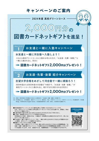 の※12024・2023年度に河合塾生ではなかった高校生が、「お友達・先輩・後輩」の対象です。※2河合塾生とは、大学受験科、高校グリーンコース、MEPLO、K会、中学グリーンコース、小学グリーンコース、河合塾NEXT、河合塾Wings、KAWAIJUKUEnglishSchool、河合塾美術研究所(本科・専科)、COSMOの在籍者です。●河合塾高校グリーンコースへの入塾申込時にご利用いただけるキャンペーンです。なお、本キャンペーンご利用には申込時にクーポンコードの入力が必要です。詳細は、Webサイトにてご確認ください。●入塾手続完了後のお申し出には応じられませんのであらかじめご了承ください。●ご兄弟・姉妹間でのキャンペーンご利用はできません。河合塾生のご兄弟・姉妹の方は、入塾金が一部免除される場合がありますので、詳しくは12ページをご覧ください。●「お友達と一緒に入塾キャンペーン」では、一緒にお申し込みされた2名以上が受講されなかった場合、本キャンペーンの適用となりません。◆図書カードネットギフトお渡し方法◆「お友達と一緒に入塾キャンペーン」では一緒にお申し込みされた2名以上の受講開始後、「お友達・先輩・後輩紹介キャンペーン」では紹介された方の受講開始後に図書カードネットギフトを送信いたします。なお、送信までには、受講開始後1〜2カ月程度かかる予定です。2024年度または2023年度の河合塾生※2の紹介で、「お友達・先輩・後輩」※1が高校グリーンコースに入塾されると、紹介する方と紹介される方双方に図書カードネットギフト2,000円分プレゼント!お友達・先輩・後輩紹介キャンペーンキャンペーン2志望大学合格をめざして河合塾で一緒に頑張ろう!これから高校グリーンコースに入塾をお考えの方が、「お友達・先輩・後輩」※1と一緒に入塾されると、双方に図書カードネットギフト2,000円分プレゼント!お友達と一緒に入塾キャンペーンキャンペーン1お友達と一緒に河合塾へ入塾しよう!キャンペーンのご案内2,000円分2024年度高校グリーンコース図書カードネットギフトを進呈ご利用方法の詳細はこちらから2023/11/8水)公開