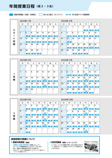受験対策講座(対面)の授業日高3生小論文(オンライン)学力診断テスト受験期間年間授業日程(高2・3生)日月火水木金土1講1講1講1講1講1講2講2講2講2講2講2講3講3講3講2024年1月3112345678910111213141516171819202122232425262728293031123日月火水木金土3講3講3講4講4講4講4講4講4講5講6講5講5講5講5講5講6講6講6講2024年2月28293031123456789101112131415161718192021222324252627282912日月火水木金土1講1講1講1講1講1講1講2講2講2講2講2講2講2講2024年4月311234567891011121314151617181920212223242526272829301234スタート学期日月火水木金土3講2講3講3講3講4講3講3講3講4講4講4講5講4講4講4講5講5講5講6講5講5講5講6講6講6講6講7講6講2024年5月2829301234567891011121314151617181920212223242526272829303111学期日月火水木金土5講5講5講5講5講5講6講6講6講6講6講6講6講7講7講7講7講7講7講7講8講8講8講8講8講2024年10月293012345678910111213141516171819202122232425262728293031122学期▶受験対策講座(映像)映像授業の受講についてなお、受講には受講日時の予約※が必要です。チューターが受講計画を立てるサポートをします。1講座につき週1講を目安に受講しましょう!※申込マイページ内「ご案内各種ダウンロード」より「塾生ガイドブック」をご確認ください。▶目的別講座(映像・e-ラーニング)て、特定のテーマ・分野をピンポイントで学習するこいつでも・どこでも受講が可能!自分の目的にあわせとができます。日月火水木金土1講1講1講1講1講1講1講2講2講2講2講2講2講2講3講3講3講3講3講3講3講4講4講4講4講4講4講4講5講2024年9月12345678910111213141516171819202122232425262728293012345