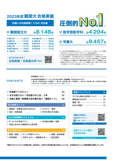 2023年度難関大合格実績桁違いの合格実績!これが、河合塾難関国立大▶東京大学▶京都大学▶北海道大学▶東北大学▶東京工業大学▶一橋大学………1,321名………1,377名………648名…………671名……253名…………366名計8,148名▶名古屋大学▶大阪大学▶神戸大学▶広島大学▶九州大学………845名…………685名…………640名…………621名…………721名まだまだあります!合格実績・合格者の声▶▶▶圧倒的医学部医学科※2早慶大※1計4,204名計9,457名の中でNo.�(オルフェウスコンサルティング株式会社調べ)。※1����年度合格実績をWebサイト・パンフレットに公表している予備校※2国公立大学医学部医学科計と私立大学医学部医学科計の合計です。*この合格実績は、����年度入試における河合塾グループ関連法人の生徒の合格状況についてまとめたものです。各大学の合格者数は、河合塾グループ関連法人の在籍者および講習受講生の集計であり、公開模試のみの受験生は含まれていません。ただし一人で複数の大学・学部・学科に合格した場合は、それぞれに合格者として計上しています。CONTENTS学年表示について����年度河合塾高校グリーンコースにおける学年(在籍期間)は以下のとおりです。●高1生:����年4月~��月末日●高2生:����年1月~��月末日●高3生:����年1月~����年3月末日※学校の学年(在学期間)とは異なりますのでご注意ください。����������●テキスト・教材●学力を伸ばす仕組み●河合塾の講師・授業●合格者インタビュー●まずは知りたい!河合塾での1日/1年●合格に直結!新課程入試を勝ち抜く「最短ルート」学力習得メソッド●理解度・定着度を高める学び方●採点・添削指導�to�合格戦略カリキュラム●ぴったりな学習プラン●志望にあわせた徹底的な入試対策���°学習サポート●質問・相談●学習環境●グッド学習サイクル●欠席フォロー/保護者の方へ��●受験・進学指導●塾生特典講座ラインアップデジタル端末の使用について……講座選びのSTEP……………………講座一覧……………………………Webで検索!………………………����������講座の内容は、Webサイトへ!河合塾高校グリーンコース2023/11/8(水)公開動画でカンタン理解!河合塾の特長2023/11/8(水)公開「新型コロナウイルスへの感染予防・拡大防止」に関する河合塾の取り組みについては、河合塾Webサイトに最新情報を掲載いたします。