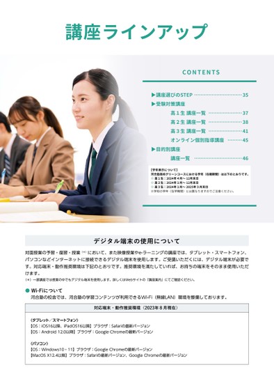 講座ラインアップCONTENTS▶講座選びのSTEP…………………………��▶受験対策講座高1生講座一覧高2生講座一覧高3生講座一覧オンライン個別指導講座▶目的別講座講座一覧…………………��…………………��…………………��………��…………………………��【学年表示について】河合塾高校グリーンコースにおける学年(在籍期間)は以下のとおりです。●高1生:����年4月~��月末日●高2生:����年1月~��月末日●高3生:����年1月~����年3月末日※学校の学年(在学期間)とは異なりますのでご注意ください。デジタル端末の使用について対面授業の予習・復習・授業(*)において、また映像授業やe-ラーニングの講座では、タブレット・スマートフォン、パソコンなどインターネットに接続できるデジタル端末を使用します。ご受講いただくには、デジタル端末が必要です。対応端末・動作推奨環境は下記のとおりです。推奨環境を満たしていれば、お持ちの端末をそのまま使用いただけます。(*)一部講座では授業の中でもデジタル端末を使用します。詳しくはWebサイトの「講座案内」にてご確認ください。●Wi-Fiについて河合塾の校舎では、河合塾の学習コンテンツが利用できるWi-Fi(無線LAN)環境を整備しております。対応端末・動作推奨環境(2023年8月現在)〈タブレット/スマートフォン〉【OS:iOS16以降、iPadOS16以降】ブラウザ:Safariの最新バージョン【OS:Android12.0以降】ブラウザ:GoogleChromeの最新バージョン〈パソコン〉【OS:Windows10・11】ブラウザ:GoogleChromeの最新バージョン【MacOSX12.4以降】ブラウザ:Safariの最新バージョン、GoogleChromeの最新バージョン