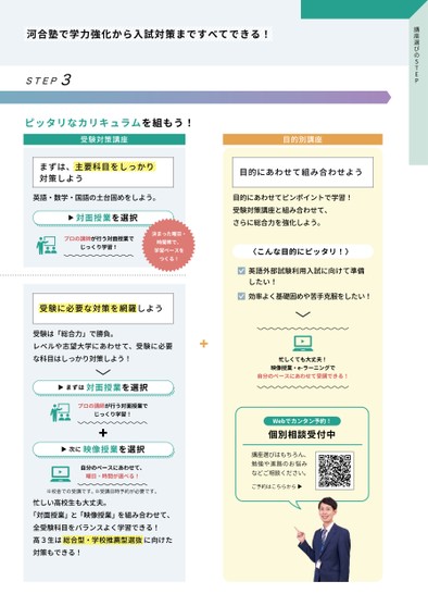 講座選びのSTEP河合塾で学力強化から入試対策まですべてできる!STEP3ピッタリなカリキュラムを組もう!受験対策講座まずは、主要科目をしっかり対策しよう英語・数学・国語の土台固めをしよう。▶対面授業を選択プロの講師が行う対面授業でじっくり学習!決まった曜日・時間帯で、学習ペースをつくる!受験に必要な対策を網羅しよう受験は「総合力」で勝負。レベルや志望大学にあわせて、受験に必要な科目はしっかり対策しよう!▶まずは対面授業を選択プロの講師が行う対面授業でじっくり学習!▶次に映像授業を選択自分のペースにあわせて、曜日・時間が選べる!※校舎での受講です。※受講日時予約が必要です。忙しい高校生も大丈夫。「対面授業」と「映像授業」を組み合わせて、全受験科目をバランスよく学習できる!高3生は総合型・学校推薦型選抜に向けた対策もできる!目的別講座目的にあわせて組み合わせよう目的にあわせてピンポイントで学習!受験対策講座と組み合わせて、さらに総合力を強化しよう。〈こんな目的にピッタリ!〉英語外部試験利用入試に向けて準備したい!効率よく基礎固めや苦手克服をしたい!忙しくても大丈夫!映像授業・e-ラーニングで自分のペースにあわせて受講できる!Webでカンタン予約!個別相談受付中講座選びはもちろん、勉強や進路のお悩みなどご相談ください。ご予約はこちらから▶