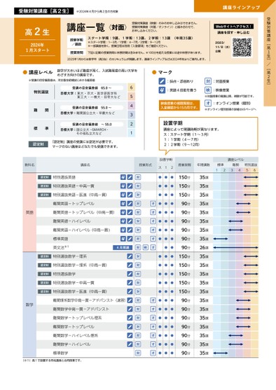 受験対策講座﹇高1生﹈/﹇高2生﹈受験対策講座[高2生]※2024年4月から高2生の方対象講座ラインアップ高2生2024年1月スタート講座一覧〈対面〉受験対策講座(映像)のみのお申し込みはできません。受験対策講座(対面/オンライン)と組み合わせて、お申し込みください。授業学期/講数授業時間スタート学期:9講、1学期:13講、2学期:13講〈年間35講〉※スタート学期:1〜3月/1学期:4〜7月/2学期:9〜12月※一部講座を除く。授業日程は別冊「入塾要項」をご確認ください。下記に記載の授業時間に休憩時間は含みません。※100分を超える授業には途中休憩があります。2025年1月からは新学年(高3生)のカリキュラムが開講します。講座ラインアップなどは2024年秋よりご案内します。Webサイトへアクセス!講座を探す・申し込む2023/11/8(水)公開●講座レベル数字が大きいほど難度が高く、入試難易度の高い大学をめざす方向けの講座です。※受講の目安偏差値は、河合塾全統模試における偏差値特別選抜受講の目安偏差値65.0〜目標大学:東大・京大・医学部医学科東工大・一橋大・旧帝大など難関受講の目安偏差値55.0〜目標大学:難関国公立大・早慶大など標準受講の目安偏差値〜55.0目標大学:国公立大・GMARCH・その他私立大など認定制「認定制」講座の受講には認定が必要です。マークのない講座はどなたでも受講できます。654321●マーク:採点・添削あり:英語4技能を養う:対面授業:映像授業※対面授業の開講以降、視聴が可能です。映像授業の視聴期間は、入金確認から15カ月です。:オンライン授業(個別)※オンライン個別指導の詳細は45ページへ設置学期講座によって開講時期が異なります。ス:スタート学期(1〜3月)1:1学期(4〜7月)2:2学期(9〜12月)4月開講教科名講座名認定制特別選抜英語認定制特別選抜英語-中高一貫認定制特別選抜英語-医進(中高一貫)難関英語-トップレベル英語難関英語-トップレベル(中高一貫)難関英語-ハイレベル難関英語-ハイレベル(中高一貫)標準英語英文法※1認定制特別選抜数学-理系認定制特別選抜数学-理系(中高一貫)認定制特別選抜数学認定制特別選抜数学-中高一貫認定制特別選抜数学-医進(中高一貫)数学難関理系数学中高一貫-アドバンスト(速習)難関数学中高一貫-アドバンスト難関数学-トップレベル理系難関数学-トップレベル難関数学-ハイレベル理系難関数学-ハイレベル標準数学(※1)高1で設置する同名講座と合同授業です。授業形式設置学期ス12授業時間年間講数標準難関1234特別選抜56講座レベル●●●●●●●●●●●●●●●●●●●●●●●●●●●●●●●●●●●●●●●●●●●●●●●●●●●●●●●●●●●●●●150分150分150分90分90分90分90分90分90分150分150分150分150分150分90分90分90分90分90分90分90分35講35講35講35講35講35講35講35講26講35講35講35講35講35講35講35講35講35講35講35講35講