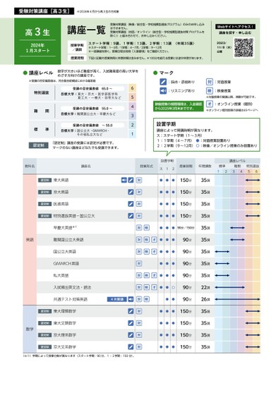 受験対策講座[高3生]※2024年4月から高3生の方対象高3生2024年1月スタート講座一覧受験対策講座(映像/総合型・学校推薦型選抜プログラム)のみのお申し込みはできません。受験対策講座(対面/オンライン〈総合型・学校推薦型選抜対策プログラムを除く〉)と組み合わせて、お申し込みください。Webサイトへアクセス!講座を探す・申し込む授業学期/講数授業時間スタート学期:9講、1学期:13講、2学期:13講〈年間35講〉※スタート学期:1〜3月/1学期:4〜7月/2学期:9〜12月※一部講座を除く。授業日程は別冊「入塾要項」をご確認ください。2023/11/8(水)公開下記に記載の授業時間に休憩時間は含みません。※100分を超える授業には途中休憩があります。●講座レベル数字が大きいほど難度が高く、入試難易度の高い大学をめざす方向けの講座です。※受講の目安偏差値は、河合塾全統模試における偏差値特別選抜受講の目安偏差値65.0〜目標大学:東大・京大・医学部医学科東工大・一橋大・旧帝大など難関受講の目安偏差値55.0〜目標大学:難関国公立大・早慶大など標準受講の目安偏差値〜55.0目標大学:国公立大・GMARCH・その他私立大など認定制「認定制」講座の受講には認定が必要です。マークのない講座はどなたでも受講できます。654321●マーク:採点・添削あり:リスニングあり:対面授業:映像授業※対面授業の開講以降、視聴が可能です。映像授業の視聴期間は、入金確認から2025年3月末までです。:オンライン授業(個別)※オンライン個別指導の詳細は45ページへ設置学期講座によって開講時期が異なります。ス:スタート学期(1〜3月)1:1学期(4〜7月)2:2学期(9〜12月)●:対面授業設置あり:映像/オンライン授業のみ設置あり教科名講座名授業形式認定制東大英語認定制京大英語認定制医進英語認定制特別選抜英語-国公立大早慶大英語※1英語難関国公立大英語国公立大英語GMARCH英語私大英語入試頻出英文法・語法共通テスト対策英語4月開講数学認定制東大理類数学認定制東大文類数学認定制京大理系数学認定制京大文系数学(※1)学期によって授業分数が異なります(スタート学期:90分、1・2学期:150分)。授業時間年間講数標準難関1234特別選抜56講座レベル設置学期ス12●●●●●●●●●●●●150分150分150分150分35講35講35講35講35講35講35講35講35講22講26講35講35講35講35講●●●90分/150分●●●●●●●●●●●●●●●●●●●●●●●●●●●●90分90分90分90分90分90分150分150分150分150分