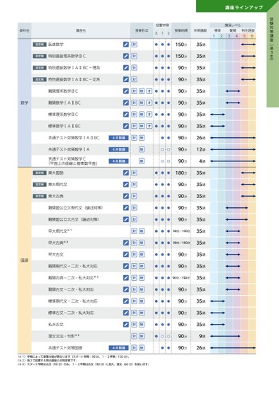 受験対策講座﹇高3生﹈講座ラインアップ授業時間年間講数標準難関1234特別選抜56講座レベル設置学期ス12●●●●●●●●●●●●●●●●●●●●●●●●●●150分150分90分90分90分90分90分90分90分90分90分●●●180分●●●●●●●●●●●●90分90分90分90分●●●90分/150分●●●90分/150分●●●●●●90分90分●●●90分/150分●●●●●●●●●●●●●●●90分90分90分90分90分90分教科名講座名授業形式認定制医進数学認定制特別選抜理系数学ⅢC認定制特別選抜数学ⅠAⅡBC-理系認定制特別選抜数学ⅠAⅡBC-文系難関理系数学ⅢC数学難関数学ⅠAⅡBC標準理系数学ⅢC標準数学ⅠAⅡBC共通テスト対策数学ⅠAⅡBC4月開講共通テスト対策数学ⅠA4月開講共通テスト対策数学C「平面上の曲線と複素数平面」4月開講認定制東大国語認定制東大現代文認定制東大古典国語難関国公立大現代文(論述対策)難関国公立大古文(論述対策)早大現代文※1早大古典※3早大古文難関現代文-二次・私大対応難関古典-二次・私大対応※3難関古文-二次・私大対応標準現代文-二次・私大対応標準古文-二次・私大対応私大古文漢文文法・句形※2共通テスト対策国語4月開講(※1)学期によって授業分数が異なります(スタート学期:90分、1・2学期:150分)。(※2)高2で設置する同名講座と合同授業です。(※3)スタート学期は古文(90分)のみ、1・2学期は古文(90分)に加え、漢文(60分)を扱います。35講35講35講35講35講35講35講35講26講12講4講35講35講35講35講35講35講35講35講35講35講35講35講35講35講9講26講