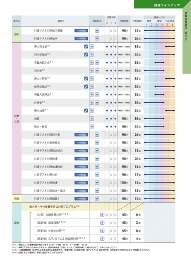 受験対策講座﹇高3生﹈講座名授業形式設置学期ス12授業時間年間講数標準難関1234特別選抜56講座レベル講座ラインアップ教科名理科地歴公民・共通テスト対策地学基礎4月開講共通テスト対策地学4月開講東大日本史※1日本史論述※1早慶大日本史※1日本史※1東大世界史※1世界史論述※1早慶大世界史※1世界史※1東大地理※1地理政治・経済90分90分●●●90分/150分●●●90分/150分●●●90分/150分●●●90分/150分●●●90分/150分●●●90分/150分●●●90分/150分●●●90分/150分●●●90分/150分●●●●●●90分90分90分90分90分90分90分90分150分150分90分45分45分45分45分13講26講35講35講35講35講35講35講35講35講35講35講35講26講26講13講26講13講13講13講13講13講6講3講6講4講共通テスト対策日本史共通テスト対策世界史4月開講4月開講共通テスト対策歴史総合4月開講共通テスト対策地理4月開講共通テスト対策地理総合4月開講共通テスト対策公共4月開講共通テスト対策倫理4月開講共通テスト対策政治・経済4月開講情報共通テスト対策情報Ⅰ4月開講総合型・学校推薦型選抜対策プログラム※2〈必須〉出願書類対策※3※4総合〈選択制〉面接対策※3※4〈選択制〉小論文対策※3〈選択制〉【プレミアム】過去問対策※3※4(※1)学期によって授業分数が異なります(スタート学期:90分、1・2学期:150分)(※2)単体でのお申し込みはできません。受験対策講座(対面/オンライン個別指導)と組み合わせて、お申し込みください。(※3)「出願書類対策」はお申し込み者全員が必須受講です。「面接対策」「小論文対策」「【プレミアム】過去問対策」は志望校の入試形式に応じて受講してください。(※4)必要に応じて講座を1講毎に追加することができます。
