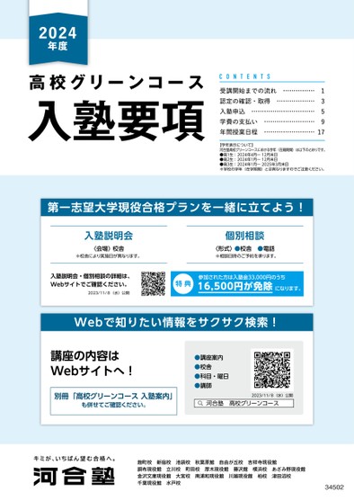 2024年度高校グリーンコース入塾要項受講開始までの流れ認定の確認・取得入塾申込学費の支払い年間授業日程1……………3………………5………………………………………………9……………………17【学年表示について】河合塾高校グリーンコースにおける学年(在籍期間)は以下のとおりです。●高1生:2024年4月〜12月末日●高2生:2024年1月〜12月末日●高3生:2024年1月〜2025年3月末日※学校の学年(在学期間)とは異なりますのでご注意ください。第一志望大学現役合格プランを一緒に立てよう!入塾説明会〈会場〉校舎※校舎により実施日が異なります。個別相談〈形式〉●校舎●電話※相談日時のご予約を承ります。入塾説明会・個別相談の詳細は、Webサイトでご確認ください。2023/11/8(水)公開特典参加された方は入塾金33,000円のうちになります。16,500円が免除Webで知りたい情報をサクサク検索!講座の内容はWebサイトへ!●講座案内●校舎●科目・曜日●講師別冊「高校グリーンコース入塾案内」も併せてご確認ください。2023/11/8(水)公開河合塾高校グリーンコース麹町校新宿校池袋校秋葉原館自由が丘校吉祥寺現役館調布現役館立川校町田校厚木現役館藤沢館横浜校あざみ野現役館金沢文庫現役館大宮校南浦和現役館川越現役館柏校津田沼校千葉現役館水戸校34502