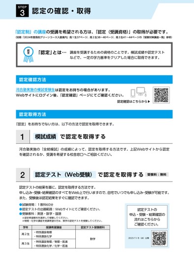 「認定制」の講座の受講を希望される方は、「認定(受講資格)」の取得が必要です。(別冊「2024年度高校グリーンコース入塾案内」高1生37ページ、高2生38〜40ページ、高3生41〜44ページの「受験対策講座一覧」参照)講座を受講するための資格のことです。模試成績や認定テストなどで、一定の学力基準をクリアした場合に取得できます。「認定」とは…認定3STEP認定の確認・取得認定確認方法河合塾実施の模試受験生は認定をお持ちの場合があります。Webサイトにログイン後、「認定確認」ページにてご確認ください。認定確認はこちらから▶認定取得方法「認定」をお持ちでない方は、以下の方法で認定を取得できます。1模試成績で認定を取得する河合塾実施の「全統模試」の成績によって、認定を取得する方法です。上記Webサイトから認定を確認されるか、受講を希望する校舎窓口へご相談ください。2認定テスト(Web受験)で認定を取得する受験料:無料認定テストの結果を基に、認定を取得する方法です。申し込み・受験・結果確認のすべてをWeb上で行いますので、自宅でいつでも申し込み・受験が可能です。また、受験後は認定結果をすぐに確認できます。●試験時間:1教科60分●認定テストの出題範囲:Webサイトにてご確認ください。●受験教科:英語・数学・国語※認定希望教科を選択して受験してください。※物理・化学の講座を受講希望の方は、数学の認定テストを受験してください。認定テストの申込・受験・結果確認の流れはこちらからご確認ください。学年高2生高3生受講希望講座認定テスト受験教科・特別選抜物理・特別選抜化学・特別選抜物理/物理-医進・特別選抜化学/化学-医進数学2023/11/8(水)公開