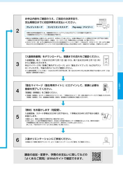 受講までの流れ認定の確認・取得入塾申込学費の支払い年間授業日程23456お申込内容をご確認のうえ、ご指定の決済手段で、支払期限日までに初回学費をお支払いください。クレジットカードコンビニエンスストアPay-easy(ペイジー)学費の決済手段登録完了には、保護者等の方のメールアドレスおよびログインⅠDの登録※が必要です。※保護者等の方のログインⅠDの事前登録は不要です。※教材は入金確認後にお届けいたしますので、お早めにご入金ください(お届け開始はスタート学期は2023年12月下旬から順次、1学期は2024年3月下旬から順次)。詳細は、13・14ページの「学費お支払い上の注意」をご覧ください。※2023/12/31(日)までに進級申込をされた2023年度高校グリーンコース高1・2生および、2024/3/31(日)までに進級申込された2023年度中学グリーンコース中3生は学費のお支払い方法が異なります。対象の方へは別途、ご案内いたします。「入塾関係書類」をダウンロードし、受講までの流れをご確認ください。入金確認後、高2・3生は2023年12月1日(金)から、高1生は2024年2月1日(木)からご確認いただけます。申込マイページ内「各種ご案内ダウンロード」より「塾生ガイドブック」などをダウンロードいただき、今後の流れについてご確認ください。※「入塾関係書類」について高2・3生は2023年12月中旬以降、高1生は2024年3月上旬以降に郵送でもお届けします(入金入塾関係書類確認後1週間程度でお届け)。「塾生マイページ(塾生専用サイト)」にログインして、受講に必要な登録を完了してください。「受講証(時間割)」をご確認ください。※「受講証(時間割)」はスタート学期は2023/12/12(火)、1学期は2024/4/1(月)以降に塾生マイページにてご確認いただけます。「受講証(時間割)」では、受講講座の時間割・教室名・使用教材や注意事項をご確認いただけます。「教材」をお届けします(宅配便)。入金確認後、スタート学期は2023年12月下旬から、1学期は2024年3月下旬から順次お届けします。※講座により、事前にお届けする教材がない場合があります。※お申し込み・ご入金が受講直前の場合や、お住まいの地域や配送センターの稼働状況によっては、教材のお届けが受講開始日に間に合わない場合もございますので、余裕をもってお申し込みください。詳しくは、下記Webサイトの「よくあるご質問」をご覧ください。入塾オリエンテーションにご参加ください。※詳細は「各種ご案内ダウンロード」より「入塾オリエンテーションのご案内」をご確認ください。3講座の追加・変更や、学費のお支払いに関してなどの「よくあるご質問」はWebサイトで確認できます。