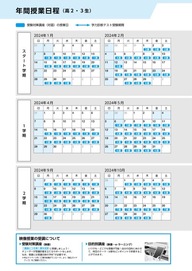 受験対策講座(対面)の授業日学力診断テスト受験期間年間授業日程(高2・3生)日月火水木金土1講1講1講1講1講1講2講2講2講2講2講2講3講3講3講2024年1月3112345678910111213141516171819202122232425262728293031123日月火水木金土3講3講3講4講4講4講4講4講4講5講6講5講5講5講5講5講6講6講6講2024年2月28293031123456789101112131415161718192021222324252627282912日月火水木金土1講1講1講1講1講1講2講2講2講2講2講2講2024年4月311234567891011121314151617181920212223242526272829301234スタート学期日月火水木金土3講3講3講3講3講3講4講4講4講4講4講4講5講5講5講5講5講5講6講6講6講6講6講2024年5月2829301234567891011121314151617181920212223242526272829303111学期日月火水木金土5講5講5講5講5講6講6講6講6講6講6講7講7講7講7講7講7講8講8講8講8講2024年10月293012345678910111213141516171819202122232425262728293031122学期▶受験対策講座(映像)映像授業の受講についてなお、受講には受講日時の予約※が必要です。チューターが受講計画を立てるサポートをします。1講座につき週1講を目安に受講しましょう!※申込マイページ内「ご案内各種ダウンロード」より「塾生ガイドブック」をご確認ください。▶目的別講座(映像・e-ラーニング)て、特定のテーマ・分野をピンポイントで学習するこいつでも・どこでも受講が可能!自分の目的にあわせとができます。日月火水木金土1講1講1講1講1講1講2講2講2講2講2講2講3講3講3講3講3講3講4講4講4講4講4講4講5講2024年9月12345678910111213141516171819202122232425262728293012345