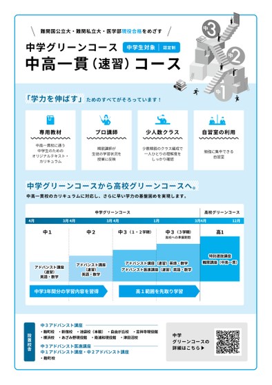 中学�年間分の学習内容を習得高1範囲を先取り学習中1中2中3(1・2学期)中3(3学期)高校への準備期間高�アドバンスト講座(速習)英語・数学アドバンスト講座(速習)英語・数学アドバンスト講座(速習)英語・数学アドバンスト医進講座(速習)英語・数学特別選抜講座難関講座(中高一貫)3中2中1中難関国公立大・難関私立大・医学部現役合格をめざす中学グリーンコース中高一貫(速習)コース認定制中学生対象「学力を伸ばす」ためのすべてがそろっています!中学グリーンコースの詳細はこちら▶設置校舎中3アドバンスト講座・麹町校・新宿校・池袋校(本館)・自由が丘校・吉祥寺現役館・横浜校・あざみ野現役館・南浦和現役館・津田沼校中3アドバンスト医進講座中1アドバンスト講座・中2アドバンスト講座・麹町校中高一貫校のカリキュラムに対応し、さらに早い学力の基盤固めを実現します。中学グリーンコースから高校グリーンコースへ。専用教材中高一貫校に通う中学生のためのオリジナルテキスト・カリキュラムプロ講師精鋭講師が生徒の学習状況を授業に反映少人数クラス少数精鋭のクラス編成で一人ひとりの理解度をしっかり確認自習室の利用勉強に集中できる自習室中学グリーンコース高校グリーンコース�月�月�月�月�月�月�月�月��月