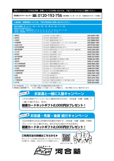 高校グリーンコースの申込手続・学費についてのお問い合わせは、下記フリーダイヤルにご連絡ください。河合塾カスタマーセンター0120-192-756®[受付時間]12:00〜19:30※日祝および12/31〜1/3を除く入塾相談・受講相談については、下記の各校舎にお問い合わせください。【受付時間】月〜土11:00〜19:00/日・祝10:00〜17:00現役館は受付時間が異なります。〈現役館※藤沢館・秋葉原館を除く〉月〜土14:00〜21:00/日・祝10:00〜17:00〈藤沢館・秋葉原館〉月〜土10:00〜21:00/日・祝10:00〜17:00■麹町校■新宿校■池袋校■秋葉原館*■自由が丘校■吉祥寺現役館*■調布現役館*■立川校■町田校■厚木現役館*■藤沢館*■横浜校■あざみ野現役館*■金沢文庫現役館*■大宮校■南浦和現役館*■川越現役館*■柏校■津田沼校■千葉現役館*■水戸校〒102-0085千代田区六番町1-3〒160-0023新宿区西新宿7-12-1〒171-0021豊島区西池袋2-29-17〒101-0032千代田区岩本町3-11-11プルータスビル3階〒152-0035目黒区自由が丘1-15-13〒180-0004武蔵野市吉祥寺本町1-8-12〒182-0024調布市布田4-17-10セントラルレジデンス調布3階〒190-0012立川市曙町1-14-13〒194-0021町田市中町1-18-6〒243-0014厚木市旭町1-3-3〒251-0052藤沢市藤沢559角若松ビル8階〒220-0004横浜市西区北幸2-11-6〒225-0011横浜市青葉区あざみ野1-1-12〒236-0021横浜市金沢区泥亀1-16-3〒330-0846さいたま市大宮区大門町3-67-2〒336-0017さいたま市南区南浦和2-24-6〒350-1122川越市脇田町5-4〒277-0005柏市柏4-3-1〒275-0026習志野市谷津1-15-33〒260-0028千葉市中央区新町17-13第12東ビル2階〒310-0015水戸市宮町1-2-22(03)3230-1581(03)3362-6581(03)3988-0581(03)5825-1581(03)5726-3261(0422)23-6581(042)440-2581(042)526-0581(042)724-7581(046)227-6581(0466)50-2581(045)312-6581(045)905-2581(045)782-7581(048)647-0581(048)884-7581(049)229-1005(04)7168-2271(047)473-7581(043)241-3581(029)302-6581※(学)河合塾主催。ただし、の校舎は(株)河合塾進学研究社主催の校舎です。※「現役館」は登録商標です。※おかけ間違いにご注意ください。ⅠP電話など、一部ご利用になれない場合があります。キャンペーン❶お友達と一緒に入塾キャンペーンこれから高校グリーンコースに入塾をお考えの方が、「お友達・先輩・後輩」と一緒に入塾されると、双方に図書カードネットギフト2,000円分プレゼント!キャンペーン❷お友達・先輩・後輩紹介キャンペーン2024年度または2023年度の河合塾生の紹介で、「お友達・先輩・後輩」が高校グリーンコースに入塾されると、紹介する方と紹介される方双方に図書カードネットギフト2,000円分プレゼント!ご利用方法の詳細はこちらから▶本キャンペーンご利用には申込時にクーポンコードの入力が必要です。詳細は、Webサイトにてご確認ください。2023/11/8(水)公開