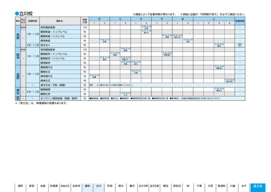 ※講座によって設置時期が異なります。※表紙に記載の「時間割の見方」を必ずご確認ください。月火水木金土12121212121234映像授業19:00〜21:40小森20:10〜21:40森(千)19:50〜21:20幸長17:10〜18:40長野19:50〜21:20柳沢18:00〜19:30松藤19:00〜21:40長野19:20〜20:50高梨(大)19:20〜20:50今田18:00〜19:30流川18:00〜19:30大野野村※ご都合に合わせて校舎で視聴してください。19:20〜20:50小竹20:10〜21:40仲野18:10〜19:40田中(久)19:30〜21:00日髙19:20〜20:50伊東(敦)----成川木下----------17:20〜18:50東内17:10〜18:40伊藤(武)17:00〜18:30長谷川19:10〜20:40酒井(完)●難関英語●標準英語●英文法●難関数学●難関理系数学中高一貫●難関数学中高一貫●標準数学※詳細は受講希望校舎までお問い合わせください。講座名特別選抜英語難関英語-トップレベル難関英語-ハイレベル標準英語英文法*特別選抜数学難関数学-トップレベル難関数学-ハイレベル標準数学難関現代文難関古文標準現代文標準古文漢文文法・句形(映像)難関物理難関化学オンライン個別指導(英語・数学)授業分数150909090901509090909090909090909090立川●立川校教科申込区分認定レベル設置時期コード1月〜12月4月〜12月1月〜12月認定制認定制-英語認定制認定制-数学1月〜12月-4月〜12月----国語理科個別*「英文法」は、映像講座の設置もあります。1ページ●2023年度/入塾/東日本/立川/高2生/パターン6617/2024_51_3_315_32_20231016143152.csv校了時削除麹町新宿池袋秋葉原自由が丘吉祥寺調布立川町田厚木藤沢あざみ野金沢文庫横浜津田沼柏千葉大宮南浦和川越水戸高2生