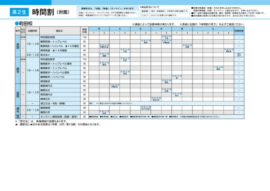 時間割(対面)授業形式は、「対面」「映像」「オンライン」があります。「対面」「オンライン」:ラインアップは、以下の時間割をご確認ください。「映像」:映像授業のラインアップは37ページをご覧ください。*申込区分について認定制「認定(受講資格)」の取得が必要な講座です。ーどなたでも受講できる講座です。●受験対策講座(映像)のみのお申し込みはできません。受験対策講座(対面/オンライン)と組み合わせて、お申し込みください。●同一名称の講座は設置校舎・曜日・時間帯・授業形式が異なっても同一内容です。●担当講師は変更になる場合がありますので、あらかじめご了承ください。高2生町田●町田校※講座によって設置時期が異なります。※表紙に記載の「時間割の見方」を必ずご確認ください。月火水木金土12121212121234映像授業19:30〜21:00横田19:30〜21:00伊藤(宏)★19:30〜21:00加藤20:10〜21:40香坂19:30〜21:00大島18:50〜21:30生田20:00〜21:30依田17:30〜19:00伊藤(武)野村※ご都合に合わせて校舎で視聴してください。20:00〜21:30安達18:10〜19:40酒井(完)20:00〜21:30佐々木(哲)18:50〜21:30下池20:00〜21:30伊藤(直)19:30〜21:00窪田19:30〜21:00吉澤18:00〜19:30隣17:30〜19:00絵川20:00〜21:30近藤19:30〜21:00栗原★17:30〜19:00富田----成川木下------------●難関英語●標準英語●英文法●難関数学●難関理系数学中高一貫●難関数学中高一貫●標準数学※詳細は受講希望校舎までお問い合わせください。授業分数1509090909015090909090909090909090909090★=4月増設★=4月増設特別選抜英語難関英語-トップレベル難関英語-ハイレベル標準英語英文法*特別選抜数学難関数学-トップレベル理系難関数学-トップレベル難関数学-ハイレベル理系難関数学-ハイレベル標準数学難関現代文難関古文標準現代文標準古文漢文文法・句形(映像)難関物理難関化学オンライン個別指導(英語・数学)1月〜12月4月〜12月認定制認定制-英語認定制認定制1月〜12月-数学1月〜12月-4月〜12月----国語理科個別教科申込区分認定レベル設置時期コード講座名*「英文法」は、映像講座の設置もあります。★:講師名に★印がある授業は1学期(4月/第10講)から開始となります。1ページ●2024年度/入塾/東日本/町田/高2生/パターン6617/2024_51_3_325_32_20230831173649.csv校了時削除