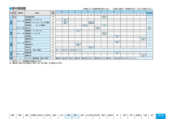 ※講座によって設置時期が異なります。※表紙に記載の「時間割の見方」を必ずご確認ください。月火水1212121木219:00〜21:40伊吹19:20〜20:5020:10〜21:40安井横田19:30〜21:00伊藤(剛)★17:40〜19:10吉川(幸)★17:40〜19:10水野19:30〜21:00大島19:20〜20:50富田19:30〜21:00清水(め)19:20〜20:50川口19:10〜20:40飯田野村※ご都合に合わせて校舎で視聴してください。金土121234映像授業----成川木下---------19:10〜20:40絵川19:10〜20:40早川20:00〜21:30古谷19:30〜21:00越野20:10〜21:40矢野●難関英語●標準英語●英文法●難関数学●難関理系数学中高一貫●難関数学中高一貫●標準数学※詳細は受講希望校舎までお問い合わせください。*「英文法」は、映像講座の設置もあります。★:講師名に★印がある授業は1学期(4月/第10講)から開始となります。麹町新宿池袋秋葉原自由が丘吉祥寺調布立川町田厚木藤沢あざみ野金沢文庫横浜津田沼柏千葉大宮南浦和川越水戸高2生授業分数150909090909090909090909090909090★=4月増設★=4月増設特別選抜英語難関英語-トップレベル難関英語-ハイレベル標準英語英文法*難関数学-トップレベル難関数学-ハイレベル標準数学難関現代文難関古文標準現代文標準古文漢文文法・句形(映像)難関物理難関化学オンライン個別指導(英語・数学)1月〜12月4月〜12月認定制認定制--1月〜12月1月〜12月-4月〜12月----英語数学国語理科個別厚木●厚木現役館教科申込区分認定レベル設置時期コード講座名1ページ●2024年度/入塾/東日本/厚木/高2生/パターン6617/2024_51_3_332_32_20230831173649.csv校了時削除