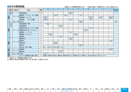19:30〜21:00森(千)19:10〜20:40大島19:30〜21:00川口17:30〜19:00流川20:10〜21:40大胡19:10〜20:40吉田20:10〜21:40西大路15:10〜16:40森(千)20:10〜21:40伊藤(宏)19:10〜20:40大野19:10〜20:40鈴木(誠)映像授業----成川木下--------------●難関英語●標準英語●英文法●難関数学●難関理系数学中高一貫●難関数学中高一貫●標準数学※詳細は受講希望校舎までお問い合わせください。*「英文法」は、映像講座の設置もあります。★:講師名に★印がある授業は1学期(4月/第10講)から開始となります。麹町新宿池袋秋葉原自由が丘吉祥寺調布立川町田厚木藤沢あざみ野金沢文庫横浜津田沼柏千葉大宮南浦和川越水戸高2生あざみ野●あざみ野現役館※講座によって設置時期が異なります。※表紙に記載の「時間割の見方」を必ずご確認ください。月火水木金土121212341212118:00〜19:30内山(洋)18:10〜19:40伊吹★17:40〜19:10鏑木18:10〜19:40吉川(幸)★219:00〜21:40安井20:00〜21:30清川18:20〜21:00岡田19:40〜21:10依田19:00〜21:40國分20:10〜21:40板谷18:10〜19:40鹿子島野村※ご都合に合わせて校舎で視聴してください。17:10〜18:40西川20:00〜21:30臼井17:10〜18:40岩村20:00〜21:30隣20:10〜21:40山崎授業分数150909090901501509090909090909090909090909090講座名★=4月増設★=4月増設特別選抜英語難関英語-トップレベル難関英語-ハイレベル標準英語英文法*特別選抜数学-理系特別選抜数学難関理系数学中高一貫-アドバンスト(速習)難関数学中高一貫-アドバンスト難関数学-トップレベル難関数学-ハイレベル標準数学難関現代文難関古文標準現代文標準古文漢文文法・句形(映像)難関物理難関化学日本史オンライン個別指導(英語・数学)教科申込区分認定レベル設置時期コード認定制認定制1月〜12月4月〜12月1月〜12月1月〜12月-4月〜12月4月〜12月--認定制-----英語数学国語理科地歴個別1ページ●2024年度/入塾/東日本/あざみ野/高2生/パターン6617/2024_51_3_339_32_20230831173649.csv校了時削除