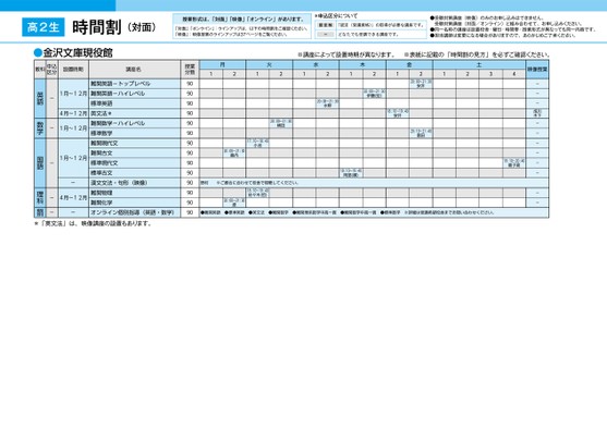 20:00〜21:30伊藤(宏)20:00〜21:30水野金220:00〜21:30安井18:10〜19:40安井20:10〜21:40富田18:10〜19:40阿部(順)19:10〜20:40鹿子島---成川木下--------高2生時間割(対面)金沢文庫●金沢文庫現役館授業形式は、「対面」「映像」「オンライン」があります。「対面」「オンライン」:ラインアップは、以下の時間割をご確認ください。「映像」:映像授業のラインアップは37ページをご覧ください。*申込区分について認定制「認定(受講資格)」の取得が必要な講座です。ーどなたでも受講できる講座です。●受験対策講座(映像)のみのお申し込みはできません。受験対策講座(対面/オンライン)と組み合わせて、お申し込みください。●同一名称の講座は設置校舎・曜日・時間帯・授業形式が異なっても同一内容です。●担当講師は変更になる場合がありますので、あらかじめご了承ください。※講座によって設置時期が異なります。※表紙に記載の「時間割の見方」を必ずご確認ください。月火水木121212121土1234映像授業●難関英語●標準英語●英文法●難関数学●難関理系数学中高一貫●難関数学中高一貫●標準数学※詳細は受講希望校舎までお問い合わせください。20:00〜21:30横田17:10〜18:40小池20:00〜21:30鹿内野村※ご都合に合わせて校舎で視聴してください。18:10〜19:40佐々木(哲)20:00〜21:30原授業分数9090909090909090909090909090難関英語-トップレベル難関英語-ハイレベル標準英語英文法*難関数学-ハイレベル標準数学難関現代文難関古文標準現代文標準古文漢文文法・句形(映像)難関物理難関化学オンライン個別指導(英語・数学)1月〜12月-4月〜12月-1月〜12月1月〜12月-4月〜12月----英語数学国語理科個別*「英文法」は、映像講座の設置もあります。教科申込区分認定レベル設置時期コード講座名1ページ●2024年度/入塾/東日本/金沢文庫/高2生/パターン6617/2024_51_3_335_32_20230831173649.csv校了時削除
