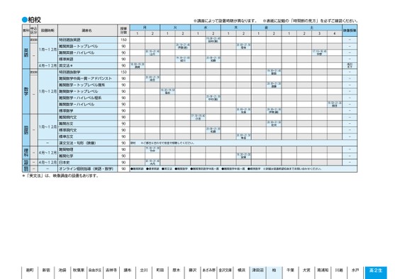 ※講座によって設置時期が異なります。※表紙に記載の「時間割の見方」を必ずご確認ください。水219:00〜21:40田村(喜)20:00〜21:30加藤月火1212120:10〜21:40伊藤(直)19:30〜21:00成川18:00〜19:30濱崎20:10〜21:40山川20:00〜21:30成合18:20〜19:50福永20:00〜21:30中村(隆)20:00〜21:30松藤17:10〜18:40小池野村※ご都合に合わせて校舎で視聴してください。19:30〜21:00竹中20:10〜21:40大内木金土12121234映像授業20:00〜21:30是枝20:00〜21:30永島20:00〜21:30隼坂19:30〜21:00安東19:00〜21:40飯島20:00〜21:30遠藤20:00〜21:30伊東(鋼)20:00〜21:30佐河17:10〜18:40仲野19:50〜21:20島田----成川木下--------------●難関英語●標準英語●英文法●難関数学●難関理系数学中高一貫●難関数学中高一貫●標準数学※詳細は受講希望校舎までお問い合わせください。*「英文法」は、映像講座の設置もあります。麹町新宿池袋秋葉原自由が丘吉祥寺調布立川町田厚木藤沢あざみ野金沢文庫横浜津田沼柏千葉大宮南浦和川越水戸高2生講座名特別選抜英語難関英語-トップレベル難関英語-ハイレベル標準英語英文法*特別選抜数学難関数学中高一貫-アドバンスト難関数学-トップレベル理系難関数学-トップレベル難関数学-ハイレベル理系難関数学-ハイレベル標準数学難関現代文難関古文標準現代文標準古文漢文文法・句形(映像)難関物理難関化学日本史オンライン個別指導(英語・数学)授業分数15090909090150909090909090909090909090909090認定レベル設置時期コード1月〜12月4月〜12月●柏校柏教科申込区分認定制認定制-英語認定制認定制1月〜12月-数学1月〜12月-4月〜12月4月〜12月-----国語理科地歴個別1ページ●2024年度/入塾/東日本/柏/高2生/パターン6617/2024_51_3_322_32_20230831173649.csv校了時削除