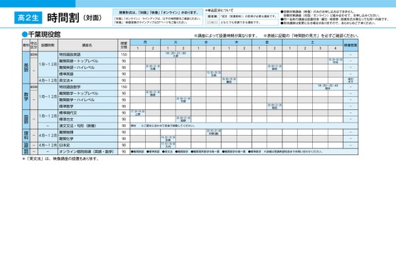 時間割(対面)授業形式は、「対面」「映像」「オンライン」があります。「対面」「オンライン」:ラインアップは、以下の時間割をご確認ください。「映像」:映像授業のラインアップは37ページをご覧ください。*申込区分について認定制「認定(受講資格)」の取得が必要な講座です。ーどなたでも受講できる講座です。●受験対策講座(映像)のみのお申し込みはできません。受験対策講座(対面/オンライン)と組み合わせて、お申し込みください。●同一名称の講座は設置校舎・曜日・時間帯・授業形式が異なっても同一内容です。●担当講師は変更になる場合がありますので、あらかじめご了承ください。高2生千葉●千葉現役館※講座によって設置時期が異なります。※表紙に記載の「時間割の見方」を必ずご確認ください。月火水木金土12121212121234映像授業20:00〜21:30石橋20:00〜21:30飯島17:30〜19:00上野18:20〜21:00久野20:00〜21:30天野20:00〜21:30岡野野村※ご都合に合わせて校舎で視聴してください。18:20〜19:5017:10〜18:40安東大内20:00〜21:30是枝20:00〜21:30島田19:20〜20:50日髙18:00〜19:30藤田20:10〜21:40中野(健)19:20〜20:50平林18:00〜20:40福永----成川木下---------●難関英語●標準英語●英文法●難関数学●難関理系数学中高一貫●難関数学中高一貫●標準数学※詳細は受講希望校舎までお問い合わせください。授業分数1509090909015090909090909090909090特別選抜英語難関英語-トップレベル難関英語-ハイレベル標準英語英文法*特別選抜数学難関数学-トップレベル難関数学-ハイレベル標準数学標準現代文標準古文漢文文法・句形(映像)難関物理難関化学日本史オンライン個別指導(英語・数学)1月〜12月4月〜12月1月〜12月1月〜12月-4月〜12月4月〜12月-認定制認定制-英語認定制認定制-----数学国語理科地歴個別*「英文法」は、映像講座の設置もあります。教科申込区分認定レベル設置時期コード講座名1ページ●2024年度/入塾/東日本/千葉/高2生/パターン6617/2024_51_3_334_32_20230831173649.csv校了時削除