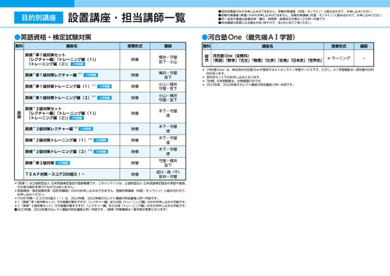 目的別講座設置講座・担当講師一覧●目的別講座のみのお申し込みはできません。受験対策講座(対面/オンライン)と組み合わせて、お申し込みください。●受験対策講座(映像)のみのお申し込みはできません。受験対策講座(対面/オンライン)と組み合わせて、お申し込みください。●同一名称の講座は設置校舎・曜日・時間帯・授業形式が異なっても同一内容です。●担当講師は変更になる場合がありますので、あらかじめご了承ください。授業形式e-ラーニング講師-講座名河合塾One(全教科)「英語」「数学」「古文」「物理」「化学」「生物」「日本史」「世界史」教科総合●河合塾One(最先端AⅠ学習)*「河合塾One」は、株式会社河合塾Oneが提供するAⅠオンライン学習サービスです。ただし、AⅠ学習機能は一部対象外の科目があります。全科目セットでのお申し込みとなります。**「生物」の学習範囲は、生物基礎のみです。*2023年度、2022年度のセレクト講座の同名講座と同一内容です。授業形式講師映像映像映像映像映像映像映像映像映像映像横井・守屋宮下・小山横井・守屋宮下小山・横井守屋・宮下小山・横井守屋・宮下木下・守屋堤木下・守屋堤木下・守屋堤木下・守屋堤守屋・横井宮下成川・森(千)安井・守屋●英語資格・検定試験対策教科講座名英検®準1級対策セット「レクチャー編」「トレーニング編(1)」「トレーニング編(2)」4月開講英検®準1級対策レクチャー編※14月開講英検®準1級対策トレーニング編(1)※14月開講英検®準1級対策トレーニング編(2)※14月開講英検®2級対策セット「レクチャー編」「トレーニング編(1)」「トレーニング編(2)」4月開講英語英検®2級対策レクチャー編※24月開講英検®2級対策トレーニング編(1)※24月開講英検®2級対策トレーニング編(2)※24月開講英検®準2級対策4月開講TEAP対策-スコア200超え!-*「英検®」は公益財団法人日本英語検定協会の登録商標です。このコンテンツは、公益財団法人日本英語検定協会の承認や推奨、*英語資格・検定試験対策(目的別講座)のみのお申し込みはできません。受験対策講座(対面/オンライン)と組み合わせて、その他の検討を受けたものではありません。お申し込みください。*「TEAP対策-スコア200超え!-」は、2023年度、2022年度のセレクト講座の同名講座と同一内容です。※1「英検®準1級対策セット」での受講が基本ですが、「レクチャー編」または各「トレーニング編」のみのお申し込みも可能です。※2「英検®2級対策セット」での受講が基本ですが、「レクチャー編」または各「トレーニング編」のみのお申し込みも可能です。●2023年度、2022年度のセレクト講座の同名講座と同一内容です。(英検®対策講座は一部内容が変更になります)