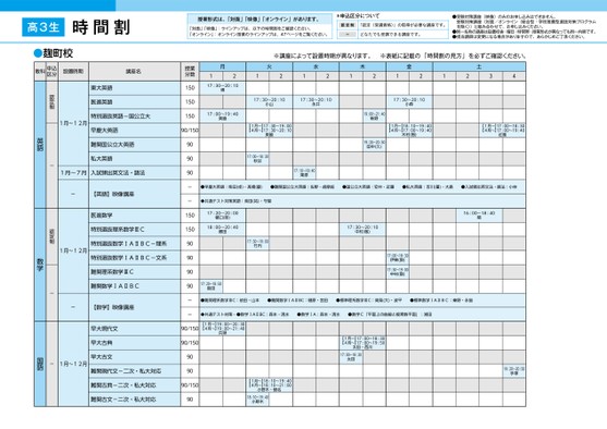 時間割授業形式は、「対面」「映像」「オンライン」があります。「対面」「映像」:ラインアップは、以下の時間割をご確認ください。「オンライン」:オンライン授業のラインアップは、47ページをご覧ください。*申込区分について認定制「認定(受講資格)」の取得が必要な講座です。ーどなたでも受講できる講座です。●受験対策講座(映像)のみのお申し込みはできません。受験対策講座(対面/オンライン〈総合型・学校推薦型選抜対策プログラムを除く〉)と組み合わせて、お申し込みください。●同一名称の講座は設置校舎・曜日・時間帯・授業形式が異なっても同一内容です。●担当講師は変更になる場合がありますので、あらかじめご了承ください。高3生麹町●麹町校※講座によって設置時期が異なります。※表紙に記載の「時間割の見方」を必ずご確認ください。月火水木金土1212121212123417:30〜20:10墺17:00〜19:40奥脇17:30〜20:10小山17:30〜20:10永井17:30〜20:10小森19:00〜21:40新野19:20〜20:50田中(久)【1月〜】18:10〜19:40【4月〜】17:00〜19:40木村(智)【1月〜】17:00〜18:30【4月〜】17:00〜19:40近嵐【1月〜】17:30〜19:00【4月〜】17:30〜20:10奥脇17:00〜18:30秋谷17:10〜18:40栗原●早慶大英語:柴田(卓)・髙橋(慶)●難関国公立大英語:佐野・胡摩﨑●国公立大英語:安井・近藤●私大英語:吉川(量)・大島●入試頻出英文法・語法:小林◆共通テスト対策英語:柴田(祐)・守屋17:20〜20:00口(哲)18:00〜20:40郷田17:30〜19:00竹内17:20〜18:50島田16:00〜18:40隣17:30〜20:10中村(敬)17:00〜18:30伊東(敦)17:30〜19:00中村(敬)●難関理系数学ⅢC:依田・山本●難関数学ⅠAⅡBC:原・宮田●標準理系数学ⅢC:高梨(大)・波平●標準数学ⅠAⅡBC:秦野・永島◆共通テスト対策…●数学ⅠAⅡBC:森本・清水●数学ⅠA:森本・清水●数学C「平面上の曲線と複素数平面」:湘田【1月〜】19:00〜20:30【4月〜】19:00〜21:40兵頭【1月〜】17:00〜18:30【4月〜】17:00〜19:50太田・西川17:00〜18:30太田19:20〜20:50手塚【1月〜】18:10〜19:40【4月〜】18:10〜21:00小野木・蝦名18:10〜19:40小野木授業分数15015015090/150909090--15015090909090--90/15090/150909090/150901月〜12月東大英語医進英語特別選抜英語-国公立大早慶大英語難関国公立大英語私大英語1月〜7月入試頻出英文法・語法-【英語】映像講座医進数学特別選抜理系数学ⅢC1月〜12月特別選抜数学ⅠAⅡBC-理系特別選抜数学ⅠAⅡBC-文系難関理系数学ⅢC難関数学ⅠAⅡBC-【数学】映像講座認定制-認定制-英語数学教科申込区分認定レベル設置時期コード講座名早大現代文早大古典早大古文難関現代文-二次・私大対応難関古典-二次・私大対応難関古文-二次・私大対応-1月〜12月国語1ページ●2024年度/入塾/東日本/麹町/高3生/パターン4617/2024_51_3_328_33_20230901092756.csv日校了時削除
