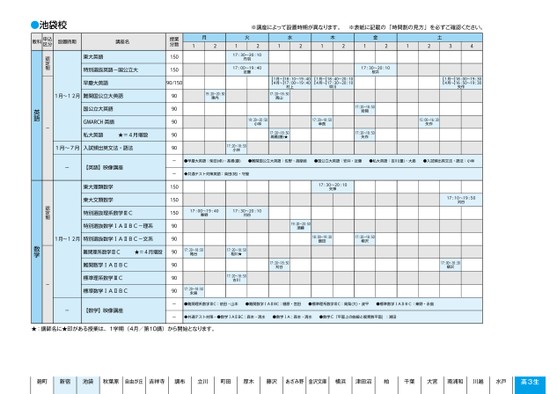 池袋●池袋校教科申込区分認定レベル設置時期コード※講座によって設置時期が異なります。※表紙に記載の「時間割の見方」を必ずご確認ください。講座名東大英語特別選抜英語-国公立大早慶大英語月12火1217:30〜20:10丹羽17:00〜19:40近藤授業分数15015090/150水木金土1212121234【1月〜】18:10〜19:40【4月〜】17:00〜19:40村上【1月〜】18:40〜20:10【4月〜】17:30〜20:10早川【1月〜】18:00〜19:30【4月〜】16:50〜19:30矢作17:30〜20:10桜井1月〜12月難関国公立大英語国公立大英語GMARCH英語私大英語★=4月増設1月〜7月入試頻出英文法・語法-【英語】映像講座東大理類数学東大文類数学特別選抜理系数学ⅢC特別選抜数学ⅠAⅡBC-理系1月〜12月特別選抜数学ⅠAⅡBC-文系難関理系数学ⅢC★=4月増設難関数学ⅠAⅡBC標準理系数学ⅢC標準数学ⅠAⅡBC-【数学】映像講座9090909090--150150150909090909090--19:20〜20:50東内17:20〜18:50高山19:20〜20:50小林17:20〜18:50幸長17:20〜18:50高橋(勝)★17:20〜18:50小林17:20〜18:50岩間17:20〜18:50矢作15:00〜16:30矢作●早慶大英語:柴田(卓)・髙橋(慶)●難関国公立大英語:佐野・胡摩﨑●国公立大英語:安井・近藤●私大英語:吉川(量)・大島●入試頻出英文法・語法:小林17:30〜20:10矢神19:20〜20:50須藤18:00〜19:30飯田17:20〜18:50柳沢◆共通テスト対策英語:柴田(祐)・守屋17:00〜19:40秦野17:30〜20:10刈谷17:20〜18:50尾台17:20〜18:50相川★17:20〜18:50刈谷17:20〜18:50古川17:20〜18:50永島●難関理系数学ⅢC:依田・山本●難関数学ⅠAⅡBC:原・宮田●標準理系数学ⅢC:高梨(大)・波平●標準数学ⅠAⅡBC:秦野・永島◆共通テスト対策…●数学ⅠAⅡBC:森本・清水●数学ⅠA:森本・清水●数学C「平面上の曲線と複素数平面」:湘田17:10〜19:50刈谷17:00〜18:30柳沢認定制-認定制-英語数学1ページ●2024年度/入塾/東日本/池袋/高3生/パターン4617/2024_51_3_314_33_20230901092756.csv校了時削除★:講師名に★印がある授業は、1学期(4月/第10講)から開始となります。麹町新宿池袋秋葉原自由が丘吉祥寺調布立川町田厚木藤沢あざみ野金沢文庫横浜津田沼柏千葉大宮南浦和川越水戸高3生