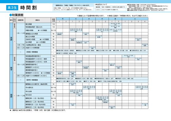 秋葉原秋葉原秋葉原秋葉原教科申込区分教科申込2★:講師名に★印がある授業は、1学期(4月/第10講)から開始となります。区分教科申込教科申込---区分区分認定レベルコード講座名-授業909090-909090分数909090990990分90909090909090909090-授業授業分数909090分数授業909090909090-月火水菊川木金土12121212121234国語-1月〜12月【国語】映像講座私大古文標準古文-二次・私大対応私大古文早大古典難関国公立大現代文(論述対策)【数学】映像講座標準数学ⅠAⅡBC標準理系数学ⅢC難関理系数学ⅢC特別選抜数学ⅠAⅡBC-文系特別選抜理系数学ⅢC共通テスト対策英語入試頻出英文法・語法私大英語難関国公立大英語特別選抜英語-国公立大東大英語東大英語標準現代文-二次・私大対応難関古典-二次・私大対応早大古文難関国公立大現代文(論述対策)難関数学ⅠAⅡBC国公立大英語難関国公立大英語【数学】映像講座特別選抜数学ⅠAⅡBC-理系【英語】映像講座GMARCH英語特別選抜英語-国公立大標準理系数学ⅢC早大現代文難関古文-二次・私大対応【国語】映像講座難関古典-二次・私大対応私大古文早大古文難関古典-二次・私大対応標準古文-二次・私大対応標準古文-二次・私大対応難関古文-二次・私大対応難関古典-二次・私大対応早大古文【数学】映像講座早大古文早大古文早大古典早大古文ⅠAⅡBCト対策数学ⅠAⅡBC難関古文-二次・私大対応標準現代文-二次・私大対応標準現代文-二次・私大対応標準現代文-二次・私大対応標準古文-二次・私大対応難関古文-二次・私大対応難関古文-二次・私大対応標準現代文-二次・私大対応策)早大古典標準現代文-二次・私大対応標準古文-二次・私大対応早大現早大古典早大古典早大古文標準古文-二次・私大対応難関古文-二次・私大対応難関古典-二次・私大対応難関古文-二次・私大対応難関国公立大現代文(論述対策)特別選抜理系数学ⅢC特別選抜英語-国公立大東大英語GMARCH英語東大英語東大英語私大英語国公立大英語難関国公立大現代文(論述対策)標準数学ⅠAⅡBC特別選抜数学ⅠAⅡBC-文系【英語】映像講座国公立大英語早慶大英語入試頻出英文法・語法共通テスト対策英語GMARCH英語難関国公立大英語難関国公立大英語難関国公立大英語私大英語国公立大英語国公立大英語国公立大英語【英語】映像講座入試頻出英文法・語法GMARCH英語GMARCH英語共通テスト対策英語私大英語私大英語GMARCH英語特別選抜理系数学ⅢC入試頻出英文法・語法入試頻出英文法・語法私大英語特別選抜数学ⅠAⅡBC-理系共通テスト対策英語共通テスト対策英語入試頻出英文法・語法特別選抜数学ⅠAⅡBC-文系特別選抜数学ⅠAⅡBC-理系【英語】映像講座【英語】映像講座共通テスト対策英語難関理系数学ⅢC特別選抜数学ⅠAⅡBC-文系特別選抜理系数学ⅢC特別選抜理系数学ⅢC難関理系数学ⅢC特別選抜数学ⅠAⅡBC-理系特別選抜数学ⅠAⅡBC-理系難関数学ⅠAⅡBC難関数学ⅠAⅡBC特別選抜数学ⅠAⅡBC-文系特別選抜数学ⅠAⅡBC-文系標準理系数学ⅢC標準理系数学ⅢC難関理系数学ⅢC難関理系数学ⅢC特別選抜理系数学ⅢC標準数学ⅠAⅡBC難関数学ⅠAⅡBC難関数学ⅠAⅡBC標準数学ⅠAⅡBC共通テスト対策数学ⅠAⅡBC共通テスト対策数学ⅠAⅡBC標準理系数学ⅢC標準理系数学ⅢC特別選抜数学ⅠAⅡBC-理系共通テスト対策数学ⅠAⅡBC標準数学ⅠAⅡBC共通テスト対策数学ⅠAⅡBC共通テスト対策数学ⅠAⅡBC難関理系数学ⅢC【数学】映像講座【数学】映像講座【数学】映像講座難関数学ⅠAⅡBC難関国公立大現代文(論述対策)特別選抜英語-国公立大特別選抜英語-国公立大★=4月増設★=4月増設★=4月増設●難関古文:坂下・山村●早大現代文:一瀬・菱山19:10〜20:4019:10〜20:40酒井(完)★酒井(完)★19:10〜20:40酒井(完)★●早大現代文:一瀬・菱山●難関古文:坂下・山村【4月〜】17:50〜20:407:2〜185017:20〜18:5017:20〜18:5019:10〜20:40【1月〜】19:10〜20:4017:20〜18:5017:20〜18:5017:20〜18:5017:20〜18:517:20〜18:50【1月〜】19:10〜20:40【4月〜】17:50〜20:4017:20〜18:50【1月〜】19:10〜20:4019:10〜20:40磯村太田磯太田太田磯村磯村磯磯村-●2024年度/入塾/東日本●204年度/入塾/東日3ページ校削除●202年度/秋葉原秋葉原-区分教科申込教科申込区分認定レベル認定レベル1月〜12月コードコード講座名講座名90「対面」「映像」:ラインアップは、以下の時間割をご確認ください。「オンライン」:オンライン授業のラインアップは、47ページをご覧ください。授業--90909090150--9090909090150150授業授業分数9090分数9090150150150分数授業90授業分数業分数9015015090150150-909090909090909090-9090909090-9090909090909090-90909090-9090150909090-9090150--9090--90150150-909090901509090909090909090-9090-90--90---90分数授業90990909015090月月火火水水木木金金土土1122112211221122112211223344国語-1月〜12月1月〜12月1月〜12月1月〜12月認定レベル認定レベル1月〜12月-1月〜12月--1月〜12月4月〜12月-9015090/150【4月〜】17:50〜20:40【1月〜】19:10〜20:4019:10〜20:40【4月〜】17:50〜20:4019:10〜20:4018:00〜19:3019:10〜20:4019:10〜20:4017:20〜18:50平・川平賀・西19:10〜20:40【4月〜】17:50〜20:40【1月〜】19:10〜20:4019:10〜20:40【4月〜】17:50〜20:4019:10〜20:4019:10〜20:4