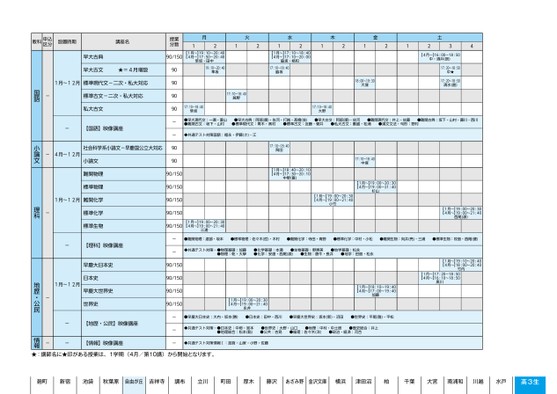 90/150【1月〜】19:10〜20:40【4月〜】17:50〜20:40隼坂・田中19:10〜20:40隼坂17:10〜18:40越野17:10〜18:40隼坂●早大現代文:一瀬・菱山●難関古文:坂下・山村【1月〜】17:10〜18:40【4月〜】17:10〜20:00脇坂・格和17:10〜18:40脇坂18:00〜19:30大窪17:10〜18:40大野【4月〜】16:00〜18:50中・酒井(辰)17:20〜18:50中★17:20〜18:50清水(直)●早大古典:阿部(順)・佐河・打越・髙橋(佳)●早大古文:阿部(順)・佐河●標準現代文:青木・奥村●標準古文:近藤・菅井●私大古文:重盛・松浦●難関現代文:井上・佐藤●漢文文法・句形:野村●難関古典:坂下・山村・藤川・西川◆共通テスト対策国語:福永・伊藤(さ)・江【1月〜】19:00〜20:30【4月〜】19:00〜21:40三浦17:10〜18:40飛田【1月〜】18:40〜20:10【4月〜】17:30〜20:10中野(喜)17:10〜18:40中塚【1月〜】19:00〜20:30【4月〜】19:00〜21:40杉山【1月〜】19:00〜20:30【4月〜】19:00〜21:40小竹【1月〜】19:00〜20:30【4月〜】19:00〜21:40西尾(源)●難関物理:渡部・坂本●標準物理:佐々木(哲)・木村●難関化学:寺田・青野●標準化学:中村・小松●難関生物:向井(亮)・三浦●標準生物:牧島・西尾(健)◆共通テスト対策…●物理基礎:加藤●物理:乾・大學●化学基礎:本瀬●化学:安達・西尾(源)●生物基礎:野黒美●生物:唐牛・長井●地学基礎:松永●地学:田島・松永【1月〜】19:10〜20:40【4月〜】18:00〜20:40竹内【1月〜】17:20〜18:50【4月〜】16:10〜18:50黒川【1月〜】19:00〜20:30【4月〜】19:00〜21:40永井【1月〜】18:10〜19:40【4月〜】17:00〜19:40加藤●早慶大日本史:大内・坂本(勝)●日本史:田中・西川●早慶大世界史:坂本(新)・沼田●世界史:平尾(雅)・平松◆共通テスト対策…●日本史:中垣・宮本●地理総合:松本(聡)●世界史:大野・山口●公共:吉見●地理:中村・中土居●歴史総合:井上●倫理:佐々木(洋)●政治・経済:河合◆共通テスト対策情報Ⅰ:加賀・山家・小野・佐藤自由が丘教科申込区分認定レベル設置時期コード講座名授業分数月火水木金土1212121212123490909090--909090/15090/15090/15090/15090/150--90/15090/15090/15090/150---早大古典早大古文★=4月増設1月〜12月標準現代文-二次・私大対応標準古文-二次・私大対応私大古文-国語-【国語】映像講座社会科学系小論文-早慶国公立大対応小論文難関物理標準物理-4月〜12月小論文-【理科】映像講座1月〜12月早慶大日本史日本史早慶大世界史世界史--【地歴・公民】映像講座【情報】映像講座-地歴・公民-情報1月〜12月難関化学標準化学標準生物-理科2ページ●2024年度/入塾/東日本/自由が丘/高3生/パターン4617/2024_51_3_337_33_20230901092756.csv校了時削除★:講師名に★印がある授業は、1学期(4月/第10講)から開始となります。麹町新宿池袋秋葉原自由が丘吉祥寺調布立川町田厚木藤沢あざみ野金沢文庫横浜津田沼柏千葉大宮南浦和川越水戸高3生