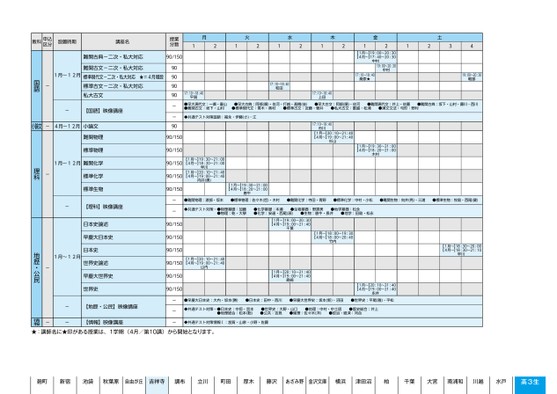 吉祥寺吉祥寺--区分教科申込教科区分----1月〜12月認定レベル1月〜12月認定レベル1月〜12月1月〜12月1月〜12月コード講座名講座名分数授業分数月月火火水島崎水島崎竹内木木永井金金永井土土1122◆共通テスト対策…●日本史:中垣・宮本●早慶大日本史:大内・坂本(勝)●早慶大日本史:大内・坂本(勝)1●地理総合:松本(聡)◆共通テスト対策…●日本史:中垣・宮本●早慶大日本史:大内・坂本(勝)●早慶大日本史:大内・坂本(勝)1聡)22●日本史:田中・西川1●日本史:田中・西川●日本史:田中・西川●日本史:田中・西川12211●早慶大世界史:坂本(新)・沼田2●早慶大世界史:坂本(新)・沼田●早慶大世界史:坂本(新)・沼田●早慶大世界史:坂本(新)・沼田2112211223344地歴・公民----【地歴・公民】映像講座【理科】映像講座【国語】映像講座標準化学標準物理難関物理小論文標準古文-二次・私大対応標準現代文-二次・私大対応難関古典-二次・私大対応難関現代文-二次・私大対応早大古文日本史論述私大古文世界史論述日本史標準生物難関化学私大古文難関古文-二次・私大対応日本史難関化学標準化学早慶大日本史標準物理難関物理小論文【国語】映像講座小論文【国語】映像講座小論文標準生物【国語】映像講座【国語】映像講座私大古文小論文私大古文標準古文-二次・私大対応私大古文難関化学標準古文-二次・私大対応標準現代文-二次・私大対応難関古文-二次・私大対応難関古文-二次・私大対応私大古文難関古典-二次・私大対応関古文二次・大対応標準現代文-二次・私大対応小論文難関古典-二次・私大対応難関現代文-二次・私大対応早大古文早大古典私大古文早大古文早大古典早大現代文標準古文-二次・私大対応難関現代文-二次・私大対応難関古文-二次・私大対応早大古文【国語】映像講座難関古文-二次・私大対応難関古典-二次・私大対応標準現代文-二次・私大対応難関現代文-二次・私大対応難関物理標準現代文-二次・私大対応標準現代文-二次・私大対応標準現代文-二次・私大対応難関古文-二次・私大対応標準古文-二次・私大対応標準物理標準古文-二次・私大対応標準古文-二次・私大対応私大古文標準古文-二次・私大対応標準現代文-二次・私大対応私大古文小論文【理科】映像講座難関物理小論文日本史論述標準物理難関物理難関化学標準物理標準生物標準化学難関化学標準生物【理科】映像講座【理科】映像講座標準生物【理科】映像講座【理科】映像講座【地歴・公民】映像講座【地歴・公民】映像講座早慶大世界史世界史世界史【地歴・公民】映像講座早慶大世界史世界史論述早慶大日本史早慶大日本史日本史論述早慶大日本史【地歴・公民】映像講座早慶大日本史日本史論述日本史論述【理科】映像講座【理科】映像講座【理科】映像講座【理科】映像講座---------●世界史:平尾(雅)・平松●世界史:平尾(雅)・平松●世界史:平尾(雅)・平松●世界史:平尾(雅)・平松情報情報情地歴・民-------【情報】映像講座【情報】映像講座【情報】映像講座【情報】映像講座◆共通テスト対策情報Ⅰ:加賀・山家・小野・佐藤◆共通テスト対策情報Ⅰ:加賀・山家・小野・佐藤◆共通テスト対策情報Ⅰ:加賀・山家・小野・佐藤5ページ●2024年度/入塾/東日本/吉祥寺/高3生/パ吉祥寺吉祥寺--区分教科申込教科申込区分-1月〜12月認定レベル認定レベル1月〜12月1月〜12月コードコード講座名講座名授業分数授業分数月月火火水水●化学基礎:本瀬●化学:安達・西尾(源)●化学:安達・西尾(源)●化学基礎:本瀬●化学:安達・西尾(源)千葉千葉●難関化学:寺田・青野●難関化学:寺田・青野●難関化学:寺田・青野竹内●生物:唐牛・長井木竹内●地学基礎:松永木●地学基礎:松永金金土土11221122●標準物理:佐々木(哲)・木村・●標準物理:佐々木(哲)・木村11●標準物理:佐々木(哲)・木村2●生物:唐牛・長井211●生物基礎:野黒美2●地学:田島・松永2112211223344地歴・公90/15090/15090/15090/15090/15090/15090/15090/15090/15090/15090/15090/15090/15090/150【1月〜】18:30〜20:00【4月〜】18:30〜21:10【1月〜】18:30〜20:00早川早【1月〜】20:10〜21:40【4月〜】19:00〜21:40【1月〜】20:10〜21:40山内山【1月〜】20:10〜21:40【4月〜】1900〜21:40【1月〜】20:10〜21:4090/15090/150【1月〜】20:10〜1:40【4月〜】1900〜21:40【1月〜】20:10〜21:40●世界史:大野・山口●公共:吉見●世界史:大野・山口●公共:吉見●地理:中村・中土居●地理:中村・中土居●歴史総合:井上●歴史総合:井上●倫理:佐々木(洋)●倫理:佐々木(洋)●政治・経済:河合●政治・経済:河合4ページ4ページ校了時削除校了時削除塾/東日本/吉祥寺/高3生/パターン4617/2024_51_3_340_33_202309010950.csv●2024年度/入塾/東日/吉祥寺/高3生/パターン417/204歴民ジ202/地歴・公民地歴・公民●2024年度/入塾/東日本/吉祥寺/高3生/パターン461702_時削除国語区分教科申込--区分教科申込-教科区分-教科申込--区分1月〜12月1月〜12月認定レベル1月〜12月90-909090909090909090-90--90分数90授909090分数-909090--909090909090909090分数909授業909090授業分数-9090909090909090-90-90-90-90-90【1月〜】19:10〜20:4019:10〜20:4019:10〜20:40【4月