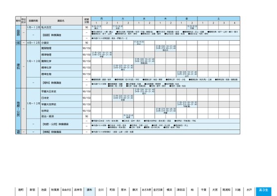国語区分教科申込-教科申込-区分教科申込-------認定レベルコード4月〜12月設置時期1月〜12月1月〜12月4月〜12月4月〜12月認定レベル4月〜12月認定レベル1月〜12月【国語】映像講座【地歴・公民】映像講座世界史政治・経済日本史早慶大日本史【理科】映像講座標準化学【理科】映像講座【理科】映像講座難関物理小論文小論文私大古文小論文小論文私大古文政治・経済私大古文【理科】映像講座政治・経済【地歴・公民】映像講座世界史世界史【地歴・公民】映像講座【地歴・公民】映像講座早慶大世界史世界史早慶大世界史早慶大世界史日本史【理科】映像講座【理科】映像講座【理科】映像講座【理科】映像講座【理科】映像講座標準生物早慶大世界史早慶大世界史日本史標準物理早慶大日本史難関化学日本史標準化学標準化学難関化学難関化学【理科】映像講座【理科】映像講座標準生物小論文小論文難関物理難関物理標準生物標準化学難関化学標準物理難関化学私大古文【国語】映像講座【国語】映像講座私大古文標準現代文-二次・私大対応標準古文-二次・私大対応難関物理標準物理小論文難関物理文-二次・私大対応私大古文標準古文-二次・私大対応標準現代文-二次・私大対応難関古文-二次・私大対応小論文標準現代文-二次・私大対応【国語】映像講座難関古典-二次・私大対応【国語】映像講座難関古文-二次・私大対応難関古文-二次・私大対応私大古文標準化学小論文【国語】映像講座小論文標準物理標準生物標準生物早慶大日本史日本史早慶大日本史-90-909090分数9090--90-909090-90---90分数909090授業授909090909090授業90--9090-9090--貴川太田●標準現代文:青木・奥村平賀----◆共通テスト対策国語:福永・伊藤(さ)・江◆共通テスト対策国語:福永・伊藤(さ)・江18:00〜19:3017:20〜18:5017:20〜18:50◆共通テスト対策国語:福永・伊藤(さ)・江小論文国語17:20〜18:5017:20〜18:5017:20〜18:50正上正上正上理科-----------4月〜12月1月〜12月4月〜12月4月〜12月1月〜12月4月〜12月----●難関物理:渡部・坂本●難関物理:渡部・坂本●標準物理:佐々木(哲)・木村●標準物理:佐々木(哲)・木村●難関化学:寺田・青野●化学基礎:本瀬●化学:安達・西尾(源)●化学基礎:本瀬●化学:安達・西尾(源)●難関化学:寺田・青野西川西川●標準化学:中村・小松●標準化学:中村・小松●難関生物:向井(亮)・三浦●難関生物:向井(亮)・三浦●標準生物:牧島・西尾(健)●標準生物:牧島・西尾(健)地歴・公民-区分教科申込----認定レベル1月〜12月1月〜12月1月〜12月1月〜12月1月〜12月1月〜12月1月〜12月1月〜12月-90-9090-19:10〜20:4019:10〜20:4019:10〜20:40船津船津船津---●早慶大日本史:大内・坂本(勝)●早慶大日本史:大内・坂本(勝)●早慶大日本史:大内・坂本(勝)●日本史:田中・西川●日本史:田中・西川●日本史:田中・西川●早慶大世界史:坂本(新)・沼田●早慶大世界史:坂本(新)・沼田●早慶大世界史:坂本(新)・沼田●世界史:平尾(雅)・平松●世界史:平尾(雅)・平松●世界史:平尾(雅)・平松情報情報情報---------【情報】映像講座【情報】映像講座【情報】映像講座【地歴・公民】映像講座政治・経済-----90◆共通テスト対策情報Ⅰ:加賀・山家・小野・佐藤◆共通テスト対策情報Ⅰ:加賀・山家・小野・佐藤◆共通テスト対策情報Ⅰ:加賀・山家・小野・佐藤●早慶大日本史:大内・坂本(勝)19:10〜20:40年度/入塾/東日本/調布/高3生/パターン6617/2024_51_3_367_33_20230901093653.csv校了時削除調布コード講座名授業分数月火安部安部安部西川水木金土12121212121234地歴・公民--◆共通テスト対策…●日本史:中垣・宮本●地理総合:松本(聡)●世界史:大野・山口●公共:吉見●地理:中村・中土居●歴史総合:井上●倫理:佐々木(洋)●政治・経済:河合校時削除時削4ページ●24/入塾/東日本/調布/高3生/パターン4617/2024_51_3_367高3国語国語小論小論文小文理科小論文地歴・公民地歴・公民度/入塾/東日本/調布/高3生/パターン6617/024_51_3_367_33_20309009653.s●22/パターン617/2024_51_3_372390936.cv了時除●3ページ調布調布調布コード講座名月火水木●私大古文:重盛・松浦金土12121212121234税田貴川税田17:10〜18:40太田19:20〜20:50平賀-●早大現代文:一瀬・菱山◆共通テスト対策国語:福永・伊藤(さ)・江17:20〜18:50◆共通テスト対策国語:福永・伊藤(さ)・江◆共通テスト対策国語:福永・伊藤(さ)・江◆共通テスト対策国語:福永・伊藤(さ)・江◆共通テスト対策国語:福永・伊藤(さ)・江【1月〜】20:10〜21:40【4月〜】19:00〜21:4018:00〜19:3080〜1930【1月〜】20:10〜21:40800〜93【4月〜】19:00〜21:4018:00〜19:30大現代文:一瀬・菱山●難関古文:坂下・山村現代:一瀬・菱山18:00〜19:30●難関古文:坂下・山村●難関古文:坂下・山村◆共通テスト対策国語:福永・伊藤(さ)・江小論文語4月〜12月1月〜12月1月〜12月1月〜12月1月〜1月〜12月17:20〜18:50【1月〜】20:10〜21:40【4月〜】19:00〜21:40【1月〜】20:10〜21:40【4月〜】19:00〜21:40正上理科--------1月〜12月1月〜12月1月〜12月1月〜12月1月〜12月1月〜12月1月〜12月1月〜12月1月〜12月--------------◆共通テスト対策…●物理基礎:加藤●難関物理:渡部・坂本◆共通テ